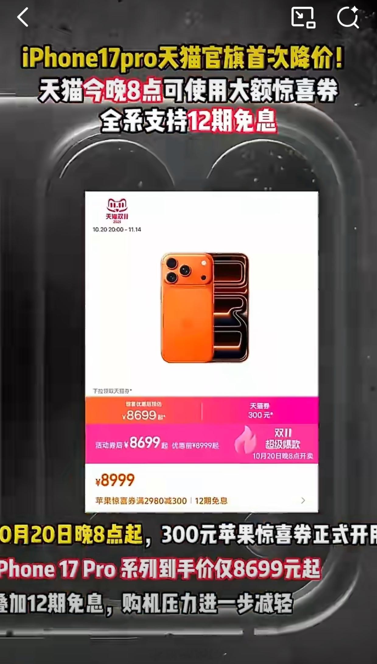 iPhone17pro天猫官旗首次降价早买早享受,晚买享折扣等等党永不吃亏[喵喵