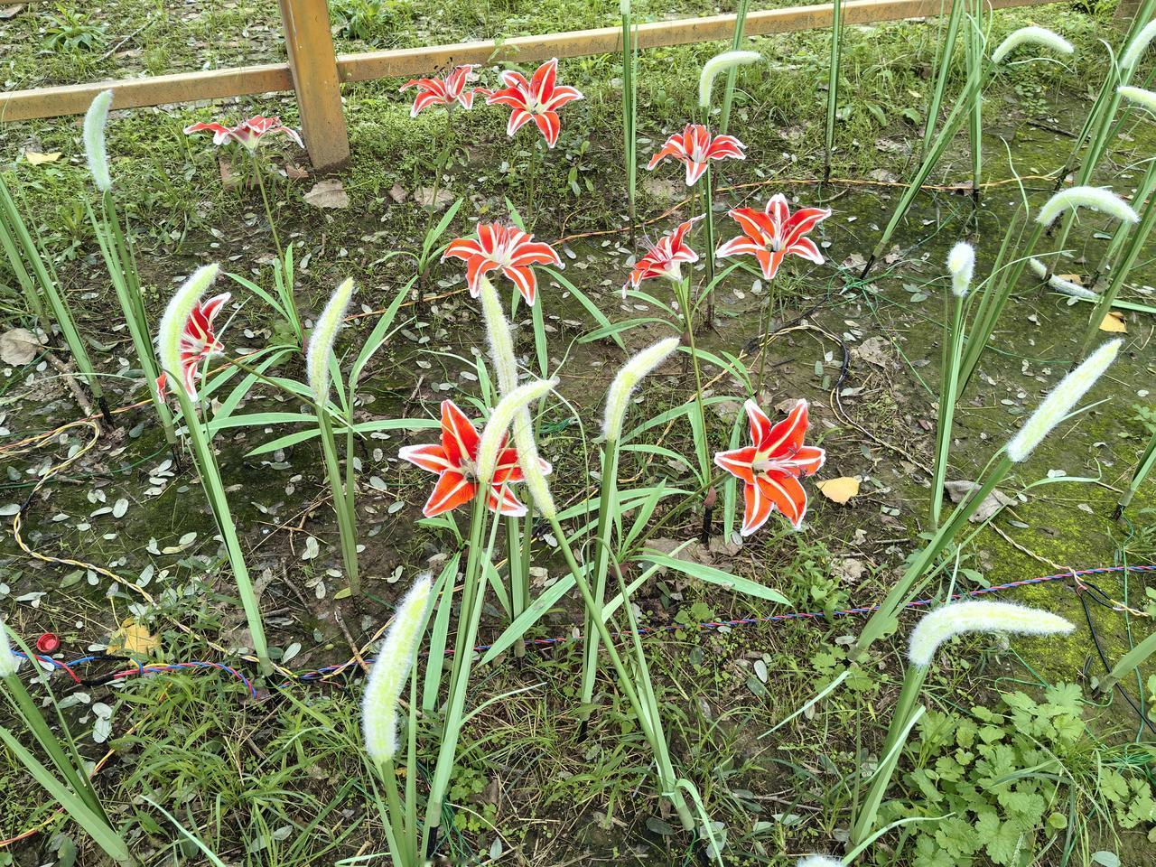 这片草地里,几株橙红带白边的花朵绽放着,花瓣舒展如星芒。 旁边是细长的绿色植株,顶端缀着毛茸茸的白色花穗,似弯弯的狐尾。 泥土间还夹杂着零星绿草与落叶,背景的木色围栏,为这片别致的花草景致添了几分质朴,仿佛在静谧中诉说着自然的灵动与野趣。
