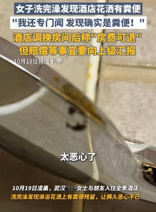10月19日,武汉一女子入住高档酒店,洗完澡发现花酒上,有一坨不明物体,她一开始以为是水垢,结果凑近一看,怀疑是粪便,她喊来朋友确认,专门凑过去闻了闻,闻到了一股恶臭,确认这就是粪便。 顿时让她们恶心不已,她们找到酒店讨说法,可酒店的回应,让她们更加气愤! 2025 年 10 月北京酒店卫生间,暖黄色灯光照在银色花洒上。 张女士朋友刚拧开水阀,手顺着花洒杆往上摸,突然像触电似的缩回。 “这是什么东西?黏糊糊的!” 她举着指尖,黄褐色黏液在灯光下扯出细丝。 水流从花洒孔喷出,却冲不散侧面沾着的几团硬物,反而让黏液晕开,露出更深的褐色。 朋友凑近一看,胃里瞬间发紧 —— 那东西的纹路像极了某种秽物,还裹着细小的纤维。 “张姐!你快进来!” 朋友的声音带着颤,手在水流下反复冲洗,却总觉得洗不干净。 张女士刚把行李放在床边,听见喊声赶紧跑过去,第一眼就看见花洒上的异常。 “水垢吧?高档酒店应该不会这么脏。” 她嘴上安慰,心里却犯嘀咕,伸手想去擦。 指尖刚碰到那团东西,就感觉到软乎乎的触感,还带着点弹性,和水垢的坚硬完全不同。 她赶紧缩回手,在毛巾上擦了又擦,毛巾上竟留下了浅褐色的印子。 “不对,水垢擦了会掉白渣,这个怎么是这样?” 张女士皱着眉,凑近花洒半臂远。 灯光下,她清楚看见黏液嵌在花洒的缝隙里,边缘还沾着几根短短的毛发。 一股若有若无的异味飘进鼻子,不是消毒水的味道,反而带着点酸腐感。 她屏住呼吸,又往前凑了凑,异味突然变浓,直冲鼻腔 —— 那是粪便特有的恶臭! “呕 ——” 她赶紧捂住嘴后退,差点撞到身后的洗手台,脸色瞬间变得惨白。 朋友见她这样,也壮着胆子凑过去闻了闻,刚吸一口气就猛地别过头:“是粪便!千真万确!” 两人站在卫生间门口,看着那台花洒,浑身都觉得发毛。 “保洁阿姨不是刚说消过毒吗?还特意指给我们看!” 张女士突然想起办理入住时的场景。 她快步走到门口,拉开一条缝,看见保洁车还停在走廊尽头,阿姨正靠在车边玩手机。 “不行,得让她过来看看!这到底是怎么回事!” 张女士攥着拳头,推门就往外走。 保洁阿姨见她脸色不对,赶紧放下手机:“怎么了姑娘?房间有啥不满意的?” “您自己看!这就是您说的‘都拾掇干净了’?” 张女士把阿姨拉进卫生间,指着花洒。 阿姨的目光刚落到花洒上,脸色就变了,手不自觉地往后缩:“这…… 这可能是管道里的污垢,不是没清洁。” “管道污垢会有粪便味?还沾着毛发?” 张女士追问,朋友在旁边补充:“我刚摸过,软乎乎的!” 阿姨被问得说不出话,支支吾吾想拿清洁剂去擦,却被张女士拦住:“别碰!我要先取证!” 张女士掏出手机,打开录像功能,从不同角度拍摄花洒上的异物。 镜头特写里,黏液的纹路、裹着的毛发、水流冲不散的状态都清晰可见。 她又找服务员要了棉签,小心翼翼地蘸取一点样本,装进密封袋 —— 常年出差让她知道,证据不能少。 “您现在别想糊弄过去,要么找经理来,要么我们就投诉!” 张女士把密封袋举在阿姨面前。 阿姨看着密封袋里的棉签,终于松口:“我…… 我去叫经理,你们别生气。” 阿姨走后,朋友靠在墙上,还在反复搓手:“想想都恶心,我刚才差点就用这花洒洗澡了。” 张女士也觉得浑身不自在,打开卫生间的窗户通风,冷风灌进来,才稍微缓解了恶心感。 “六百多一晚的酒店,卫生做成这样,太离谱了。” 她盯着手机里的视频,越看越气。 走廊里传来脚步声,经理跟着阿姨走了过来,刚进房间就问:“怎么回事?保洁说有误会?” 张女士没说话,直接把手机递过去,视频里的画面和异味,让经理的笑容瞬间僵在脸上。 如今,张女士每次想起当时发现问题的场景,还是会觉得恶心。 那根装在密封袋里的棉签,成了维权的关键证据,也成了她出差时检查酒店卫生的 “警钟”。 她在出差群里分享经验时,总会强调:“进房间先查花洒,别信保洁的口头保证,自己亲眼看见、亲手摸过才放心。” 虽然维权结果还没出来,但每次想起当时果断取证、不轻易妥协的自己,她就更坚定 —— 不能让更多人经历这种糟心的事,卫生底线必须守住。 这件事也给其他住客提了醒,高档酒店的卫生不一定靠谱,得自己多留心。 酒店行业常说 “细节决定成败”,可连花洒都清洁不好的酒店,终究会被消费者拉黑 —— 毕竟谁也不想花着高价,遭这种糟心的罪。 信源:“我还专门闻,发现确实是粪便!”女子入住知名酒店,洗完澡发现有花洒上2025-10-19 21:04·潇湘晨报·晨视频