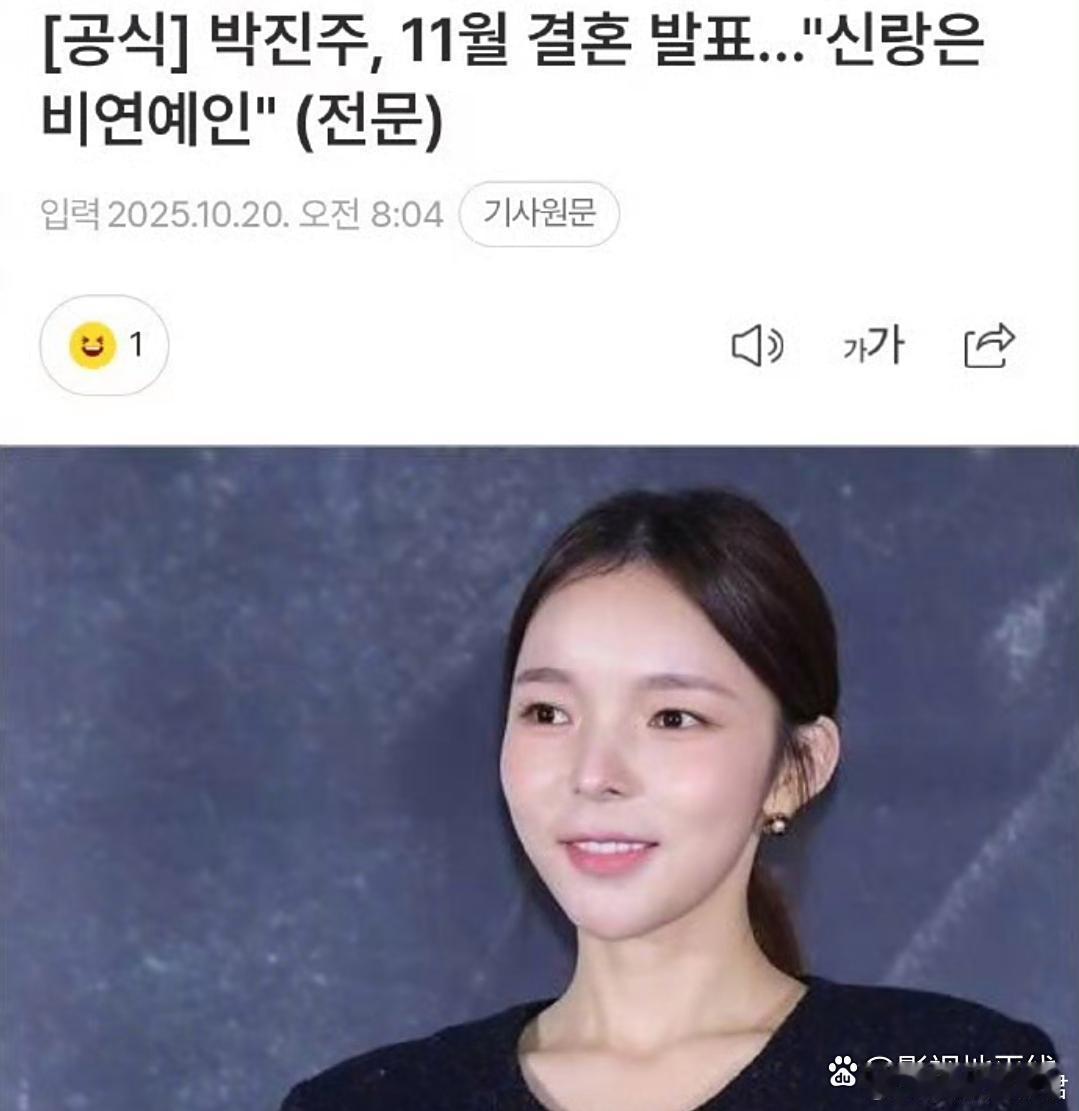 朴真珠官宣结婚据韩媒,演员朴真珠官宣11月30日结婚,丈夫为素人,婚礼采取非公开