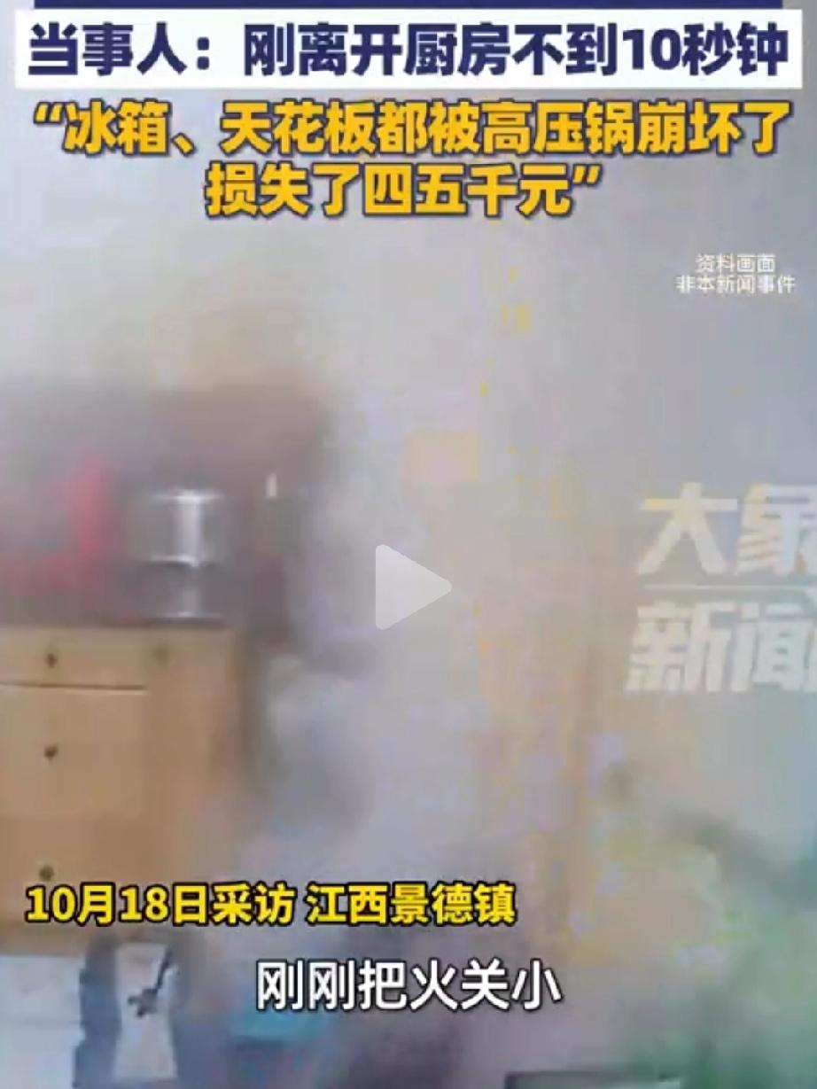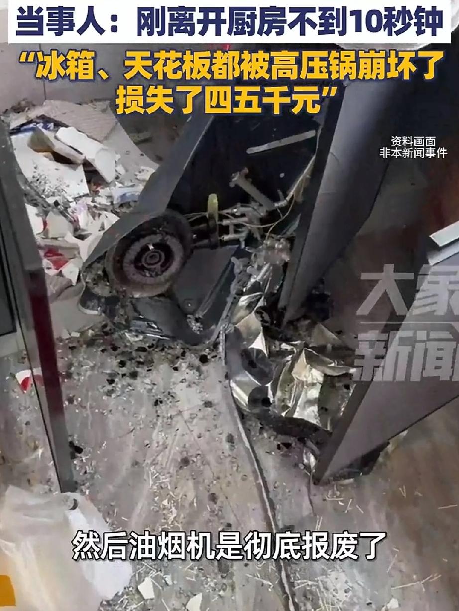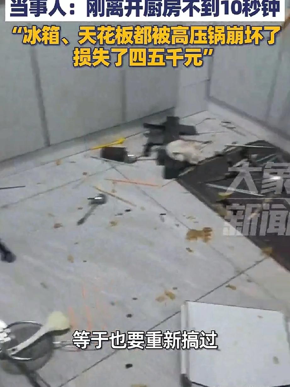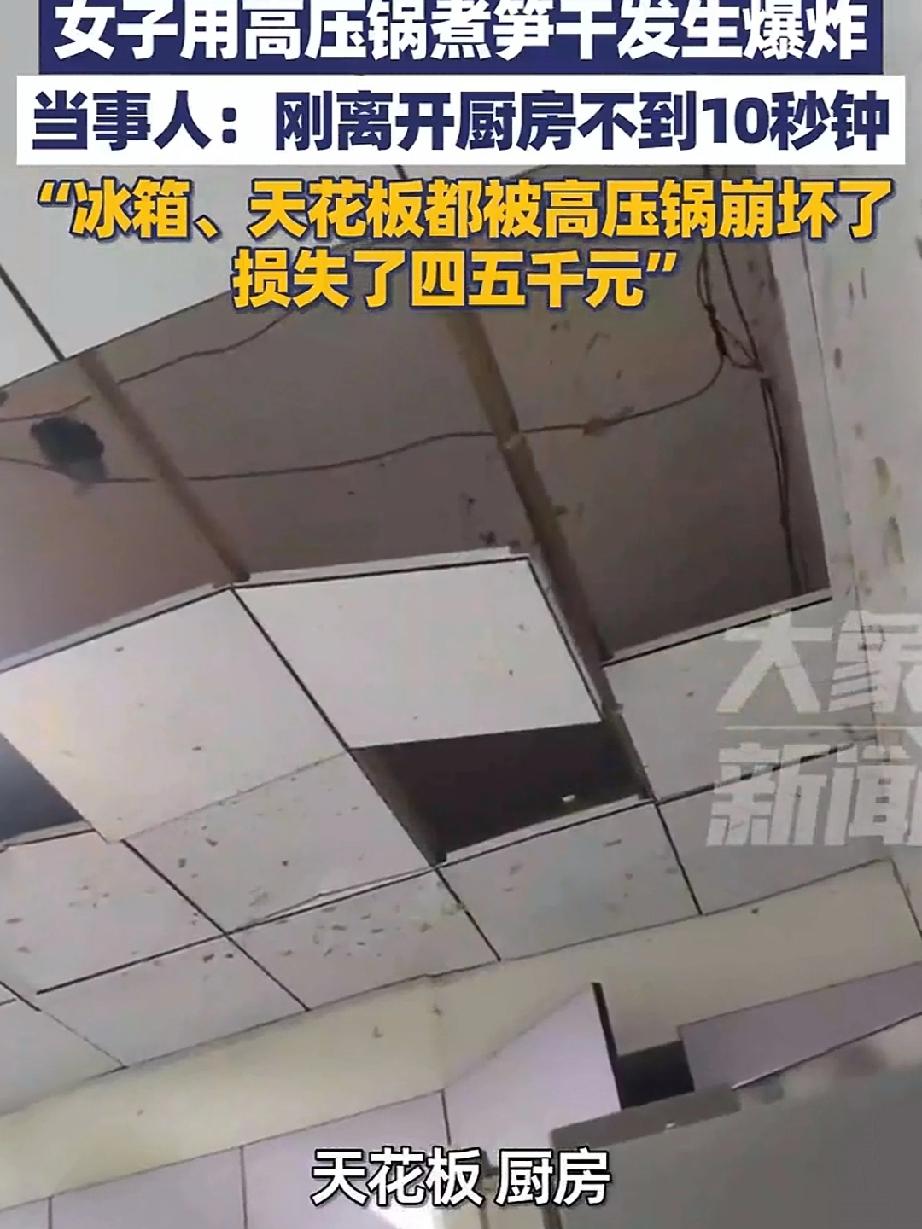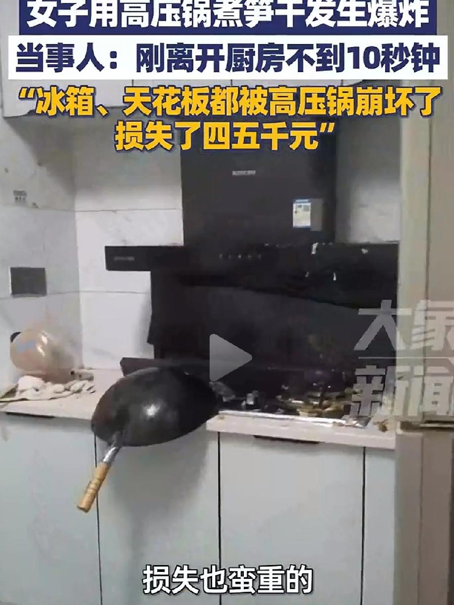 女主用高压锅煮笋干发生爆炸!刚离开不到10秒钟厨房的全部家当炸了个遍,女主听到爆