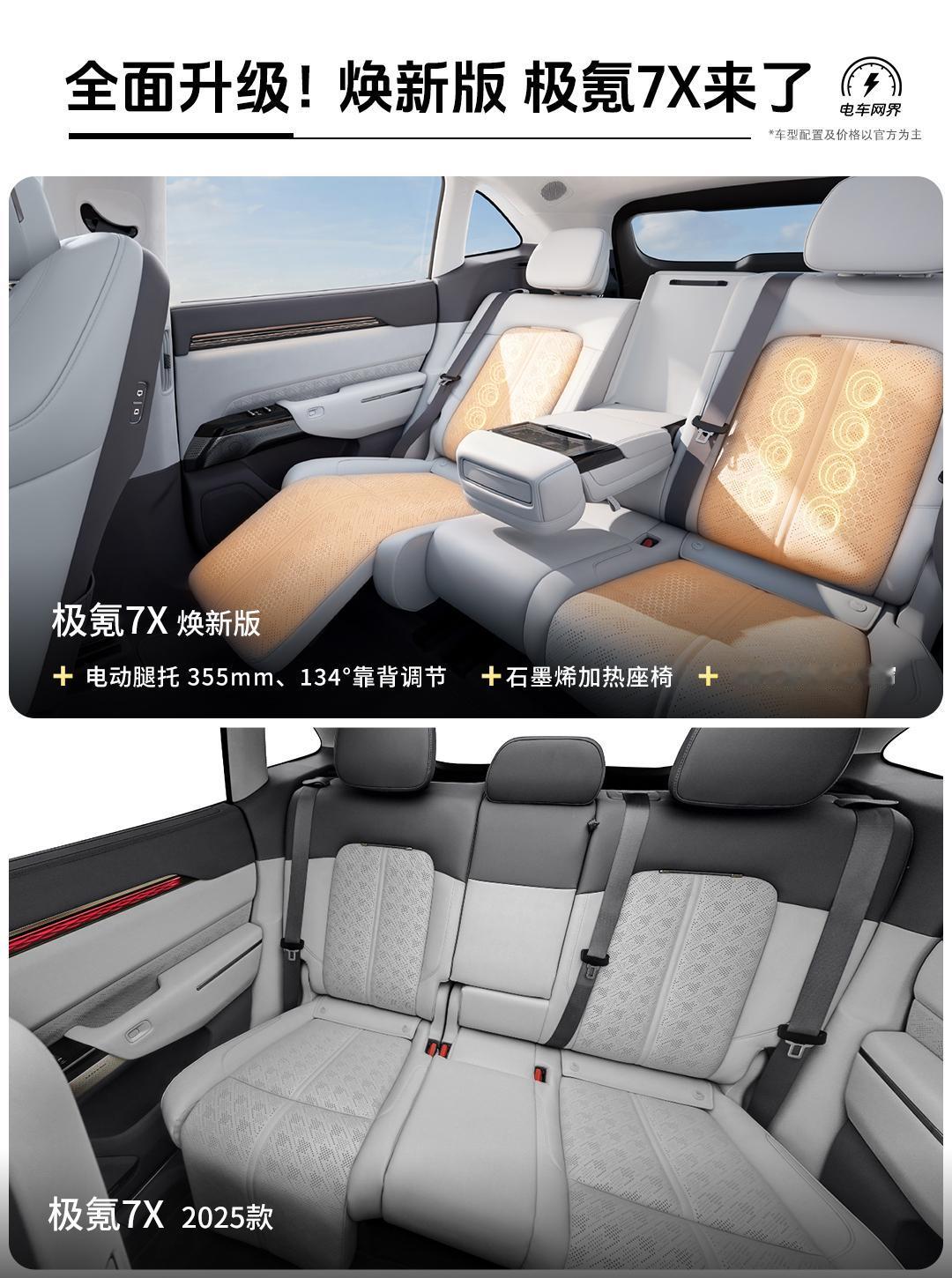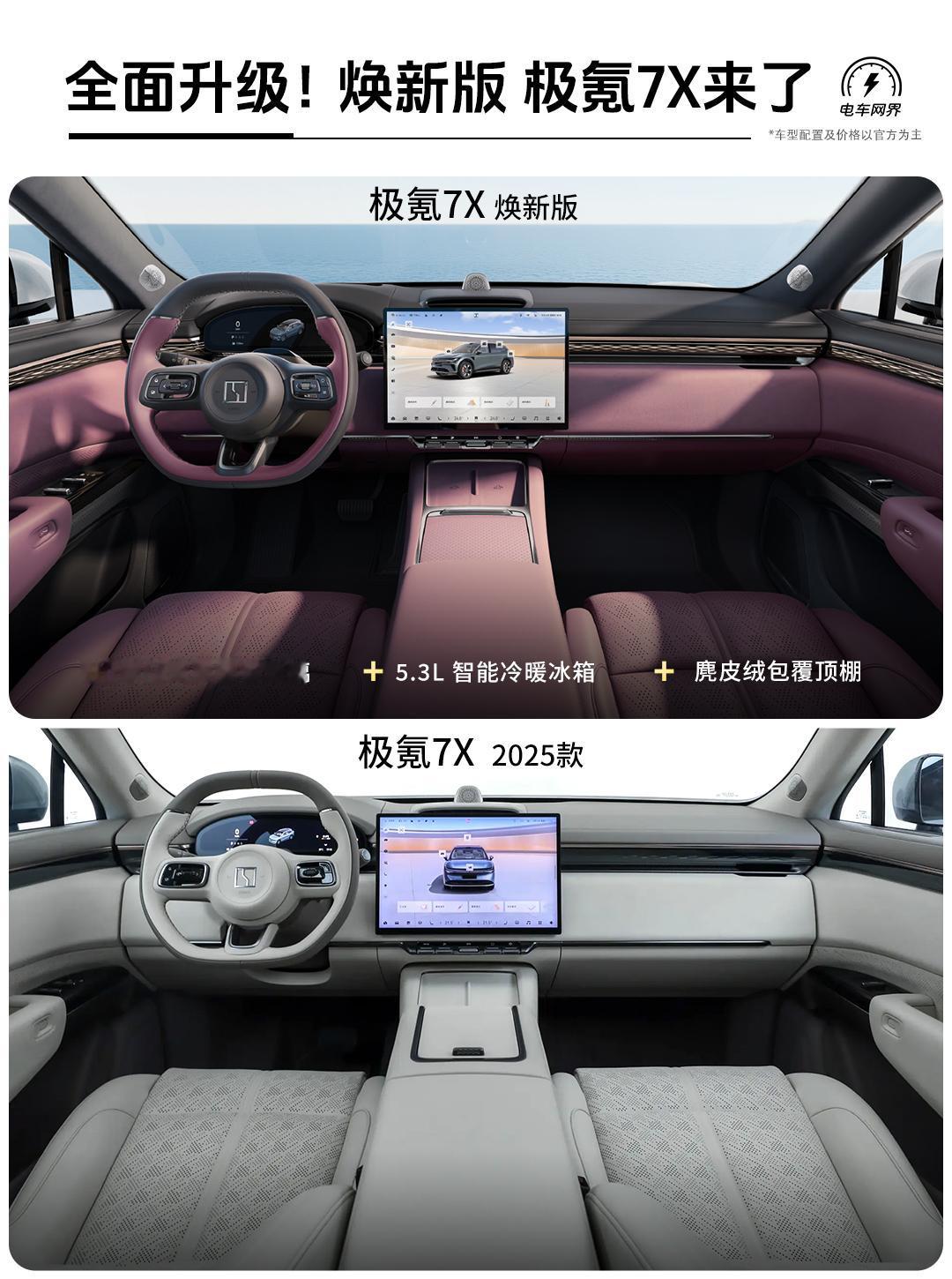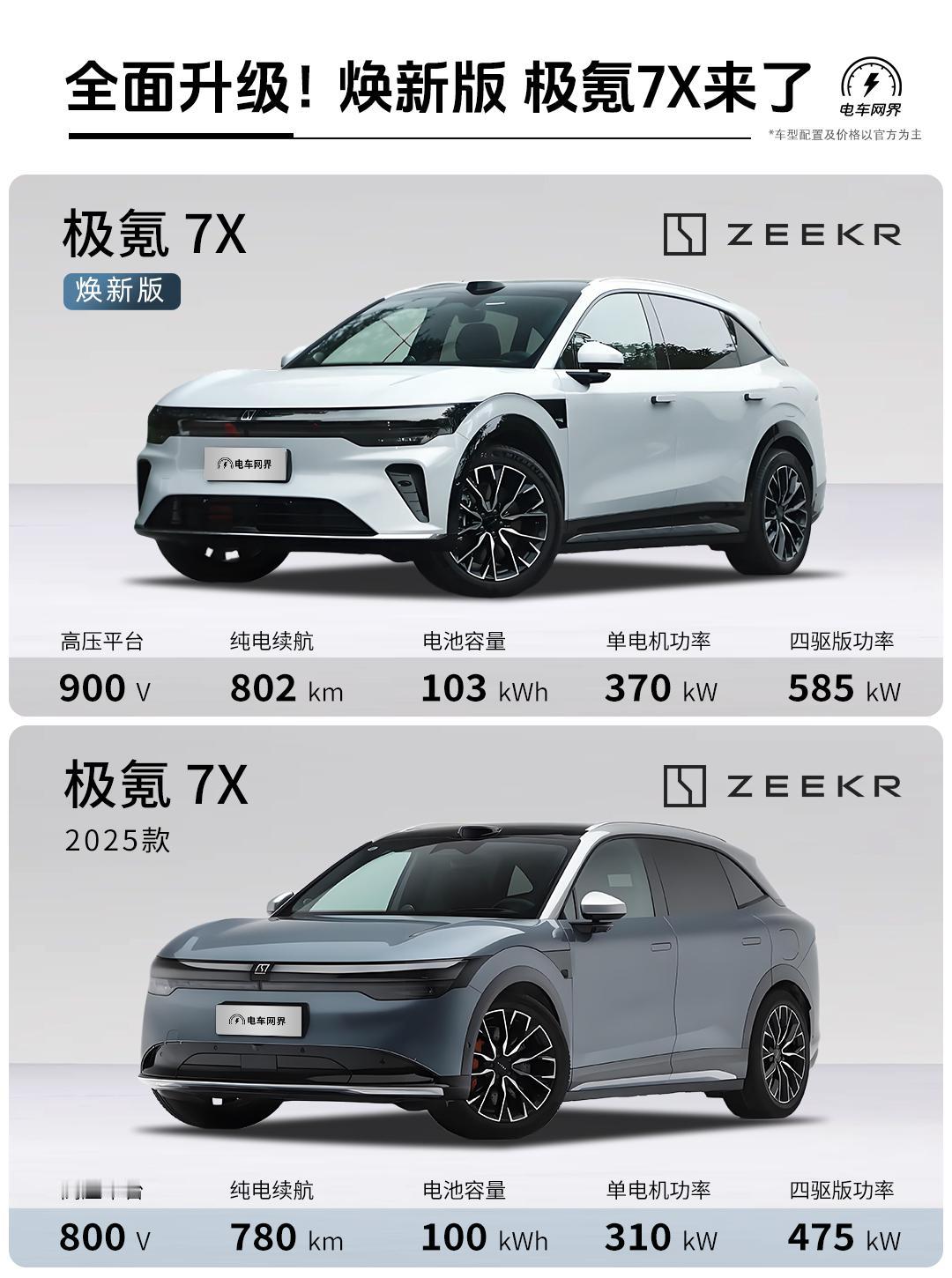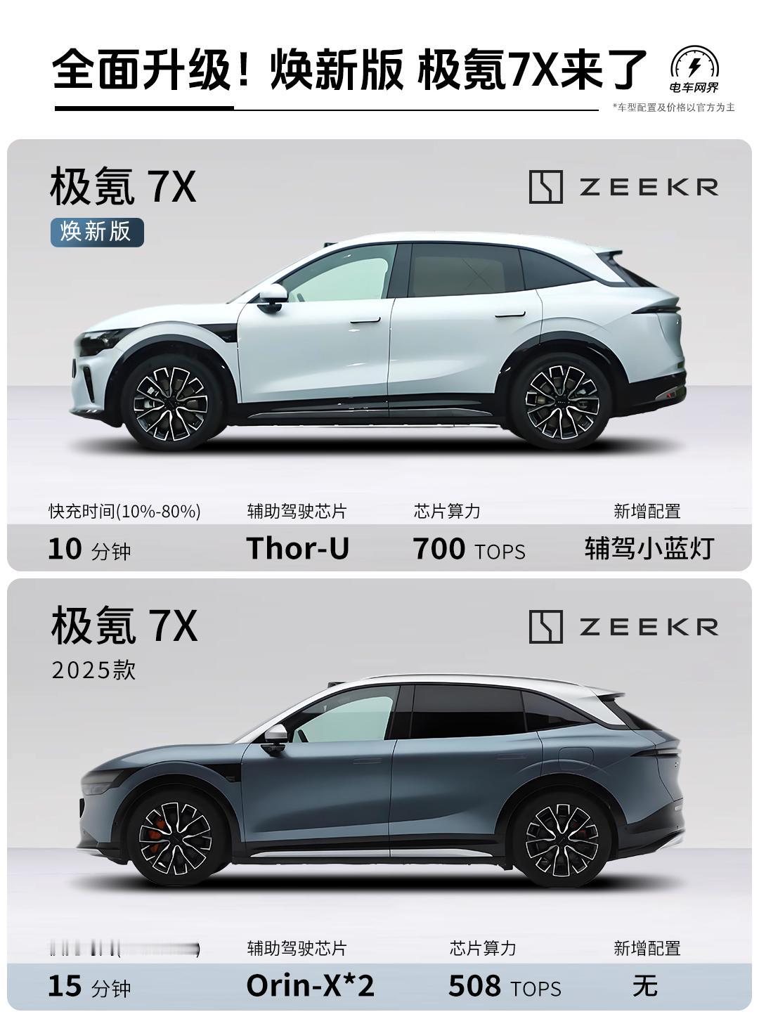 焕新版极氪7x开启预售了,相比现在7X到底有哪些升级了?带你来快速了解一下: 三电系统升级: 900V高压架构(75kWh版还是800V),SOC 10%-80%仅需10分钟。 电池:103kWh麒麟电池支持6C超充,续航达802km(老款100kWh电池CLTC最高780km)。 电机功率提升: 后驱Max版:功率370kW(老款310kW)。 四驱Ultra版:双电机功率达585kW(前215kW+后370kW),零百加速2.98秒(老款四驱版475kW,3.8秒)。 智能驾驶与硬件: 焕新版搭载千里浩瀚H7辅助驾驶系统,全系标配英伟达Thor-U芯片(算力700TOPS),支持D2D车位到车位领航辅助(老款双Orin-X芯片,508TOPS)。 外观优化: 前脸增加导流槽,新增黑紫/黑橙配色、20英寸星曜轮毂,尾部牌照框上移。 座舱升级: 新增麂皮绒包覆顶棚、四门双层夹胶静音玻璃(隔音提升30%),新增5.3L冷暖冰箱,后排体验升级355mm电动腿托、134°靠背调节、石墨烯加热座椅(5分钟升温34℃)、13英寸2K OLED屏、电动桌板(老款需选配)。 焕新极氪7X估计价格上会与老款持平,配置上的全面升级提升了产品竞争力,在20-30万区间的纯电SUV中,你会帮它作为备选之一吗?【来自懂车帝车友圈】