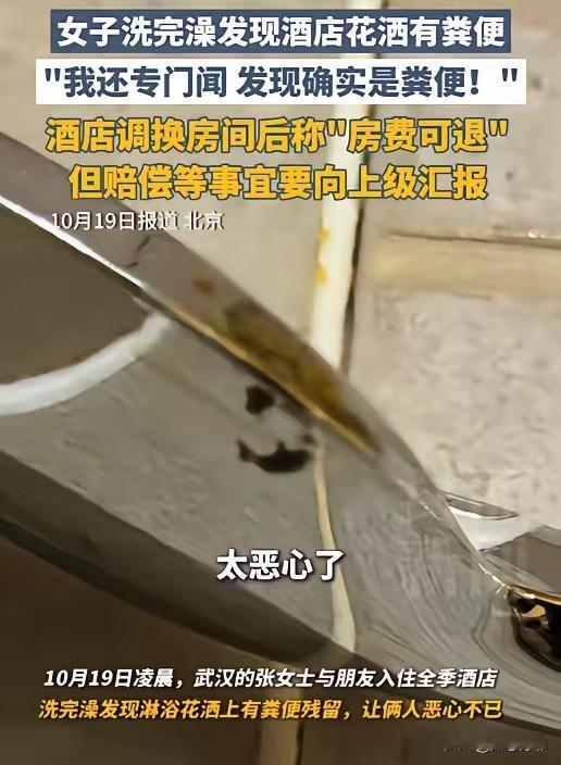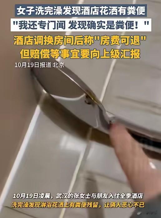 女子花费678元订了一个高档酒店的双人房,准备洗澡时却发现花酒上有一坨不明物体,她凑过去一闻,居然是粪便,顿时恶心不已。女子找到酒店讨说法,酒店:可以退还房费,赔偿事宜要向上级汇报。 北京,女子是武汉的,来找朋友玩,两人玩了一整天,之后在手机上订了一家酒店的双人房,花了678元。 到了房间,女子累得直接躺在椅子上休息,朋友先去洗澡。结果朋友刚洗完就着急喊她,说花洒上有奇怪的东西。 女子赶忙进卫生间查看,发现花洒的侧面和背面沾着些黄褐色的不明物,她忍着不适凑上去闻了闻,确认是粪便,两人都恶心得不行。 随后女子联系了前台,工作人员过来看了之后道歉,提出让保洁阿姨过来把花洒洗干净,让她们继续住,因为酒店没有空房间了。 女子当场就拒绝了,态度坚决,表示要换房间,还说这花洒就算洗了也不敢用。 僵持了一段时间,酒店才说有客人预订了房间但没入住,就把她们给换过去了。 第二天女子要赶飞机离开北京,酒店负责人才出面,说可以把房费退了,但赔偿的事还得向上级汇报。 有网友觉得这家酒店的底线太低,花洒沾粪便已经不是普通卫生问题了,是对住客的不尊重。 也有网友吐槽酒店的处理方式,觉得太敷衍了,让人寒心,退房费只是想用小钱打发人,而回避核心问题。