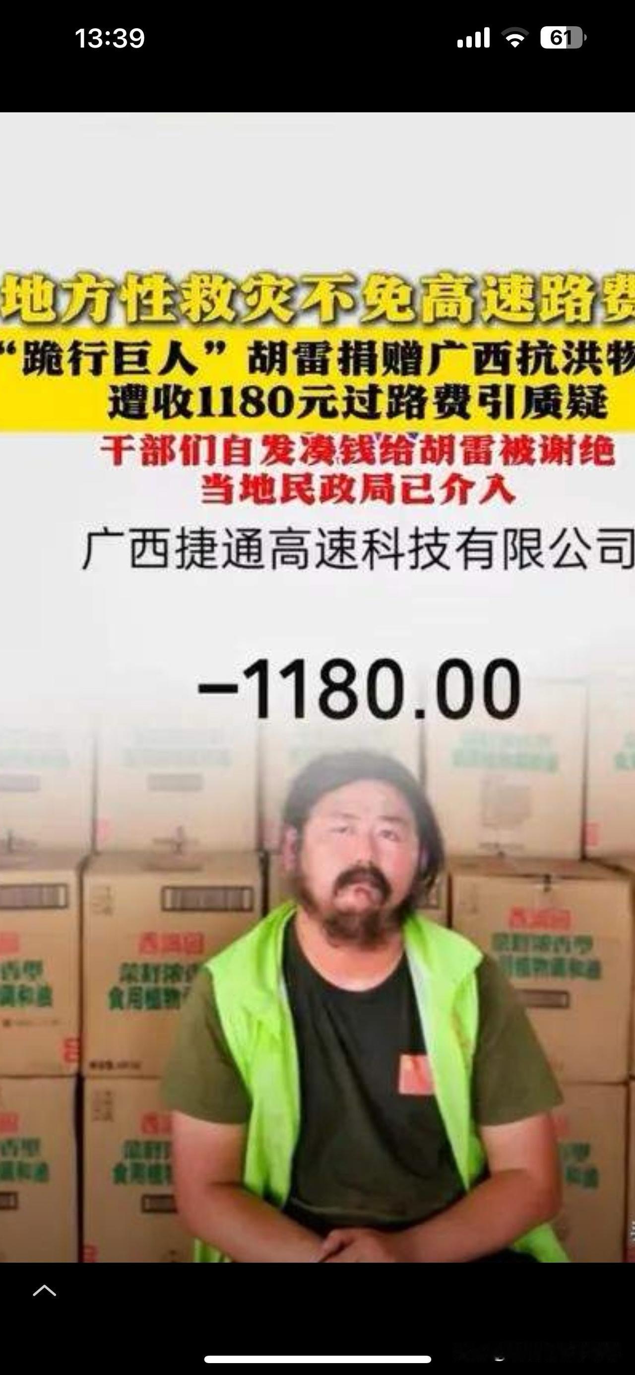 没事找事,胡雷继续讨个说法,说寒了他的心,不知道这个说法什么情况了,为什么胡雷过一段时间就出来一次,幺蛾子, 当地的相关部门已经说了 、后续核实了会退钱,目前为止胡雷不接受 ,坚持要个说法 ,不知道他眼中说法是什么 就算是广西方面收费错了,那也有好好跟他协商,补手续会退费,他又不干,当地干部给他,他又不要, 为什么非得在网上制造一波舆论呢?你真的是大善人,大好人,弄的人家广西人成了罪大恶极!人家慈善家真的是做善事,他这个犹如雪中送冰雹,吃了捐赠一波流量,又吃了高速一波流量,一次吃了两场,确实也挺高明, 让人家女孩摆拍,女孩难为的不会表达 ,如果学习不好都感觉对不住他,女孩眼里的捐赠者应该是一个高大帅气的大老板,见到这样的邋遢人女孩子心里都恐慌,可想女孩压力有多大 他给了女孩一口吃的,然后在把女孩最不堪一面,暴露在大众面前,接受指指点点, 好人是不需要博流量的。做点好事就能恶意抹黑。 真正的善,只是自己默默低调的去做!
