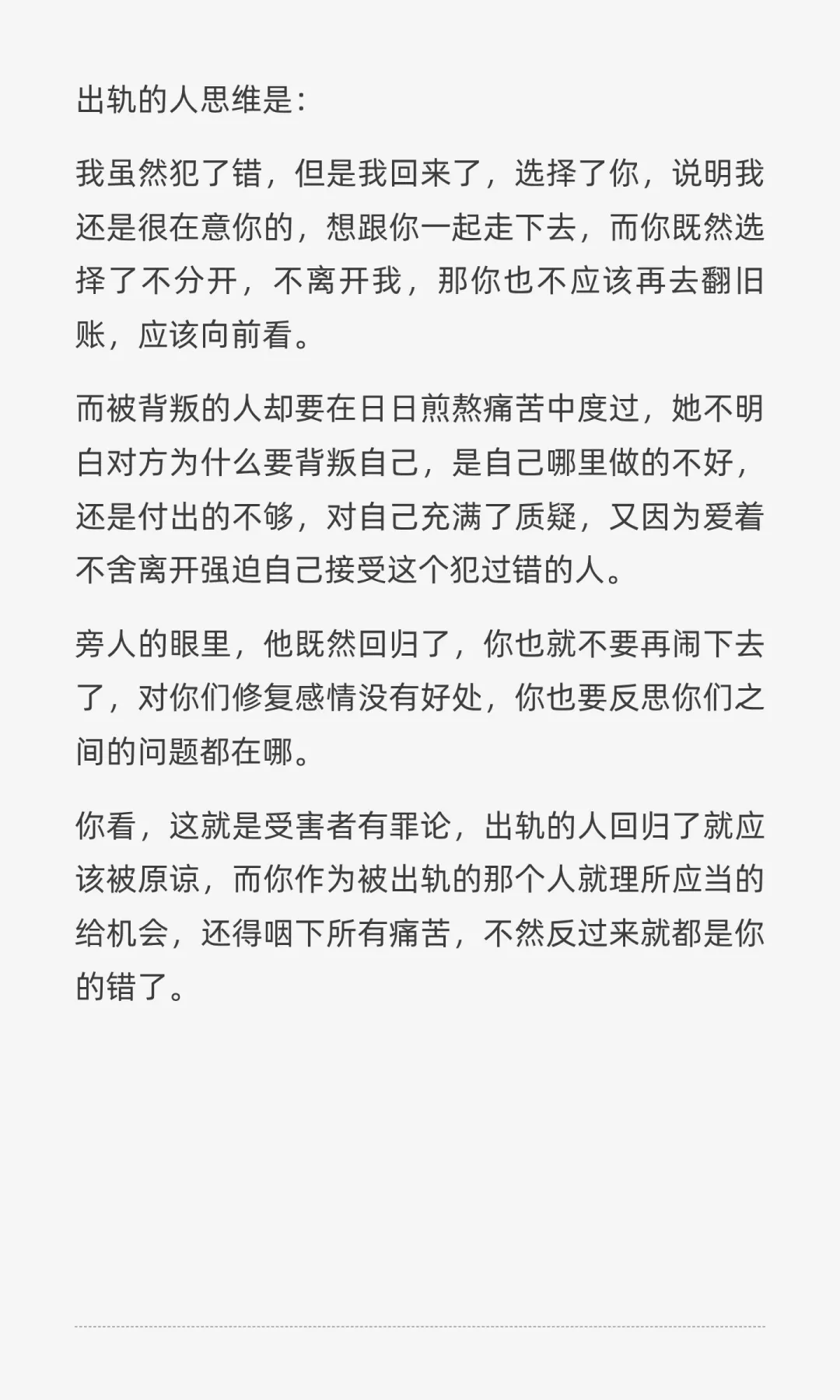 旁人的眼里,他既然回归了,你也就不要再闹下去了,对你们修复感情没有好处,你也要反思你们之间的问题都在哪。你看,这就是受害者有罪论,出轨的人回归了就应该被原谅,而你作为被出轨的那个人就理所应当的给机会,还得咽下所有痛苦,不然反过来就都是你的错了。