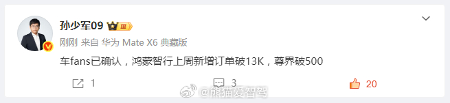据车fans透露,上周(10月13日-10月19日)鸿蒙智行全系新车新增订单破13K,尊界继续破500台!