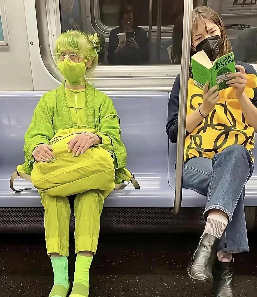 在地铁上偶遇一位时尚大妈,从头到脚绿到发光,连背包都是荧光绿的,晃得我睁不开眼。
