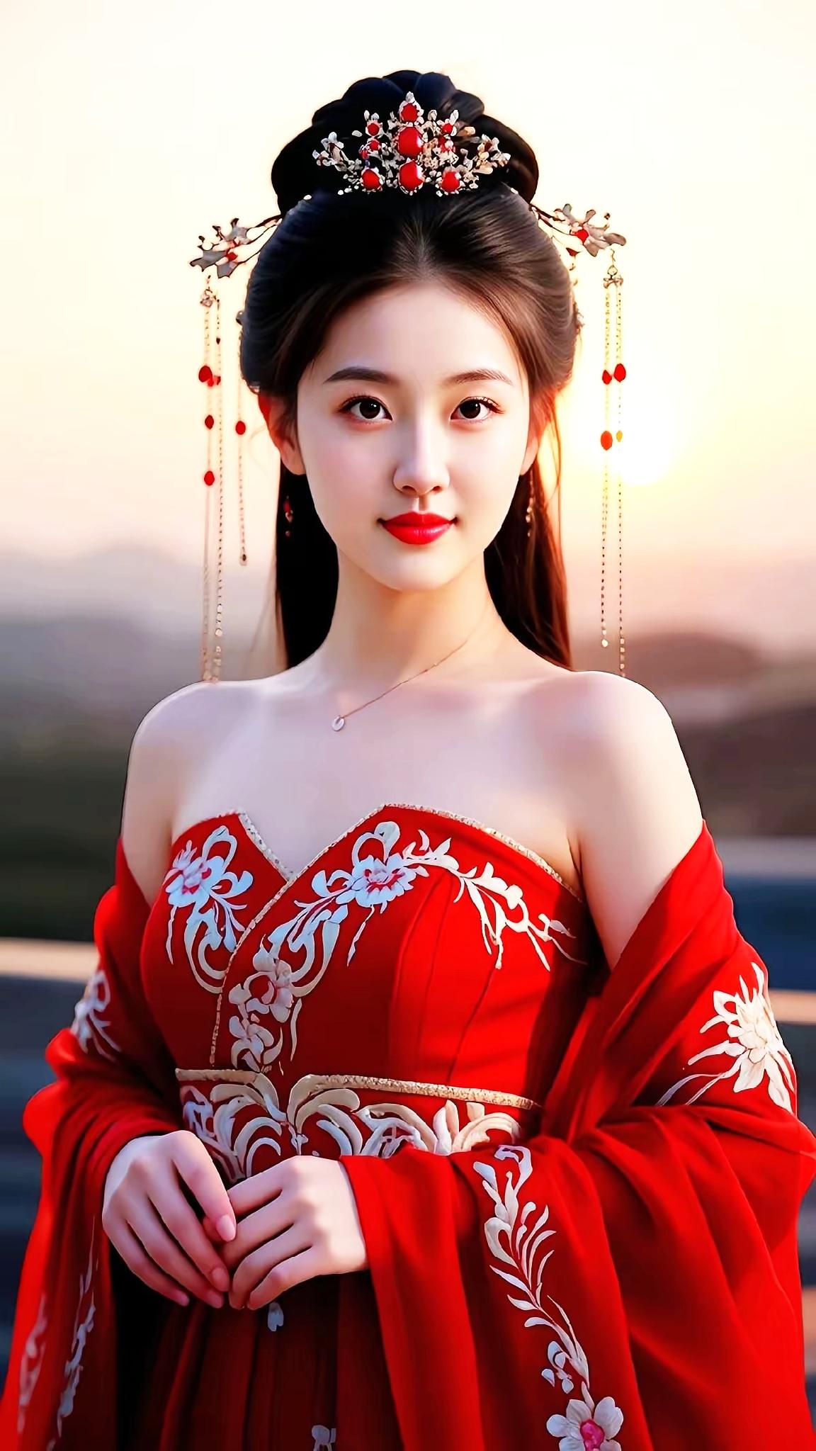 在古风小桥流水旁,穿着旗袍的少女微笑着,背景是青山绿水和盛开的荷花。