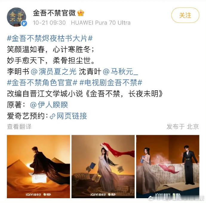 夏之光与马秋元参演《金吾不禁》的消息被正式官宣,剧集方面公布两人的加盟信息,为期