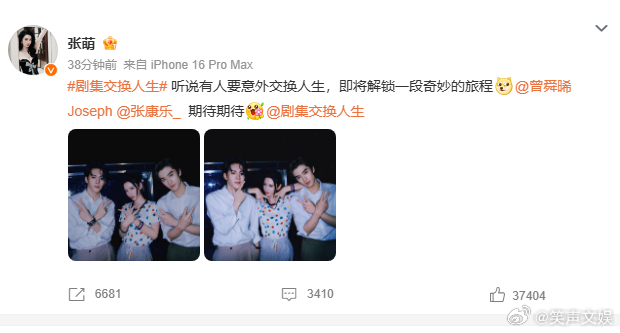 张萌赚了张萌官宣交换人生双男主 网友盼这对双男主合作已久,张萌促成圆梦,热度与口碑双收,太会赚!