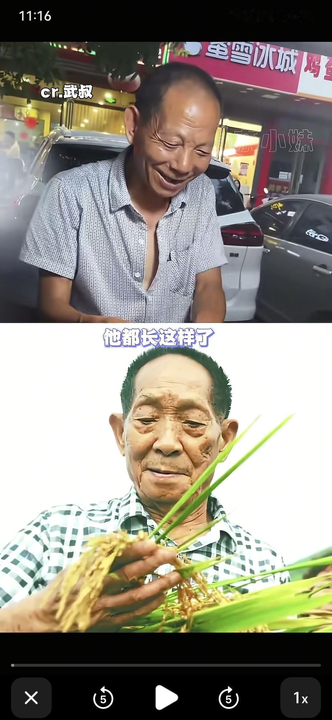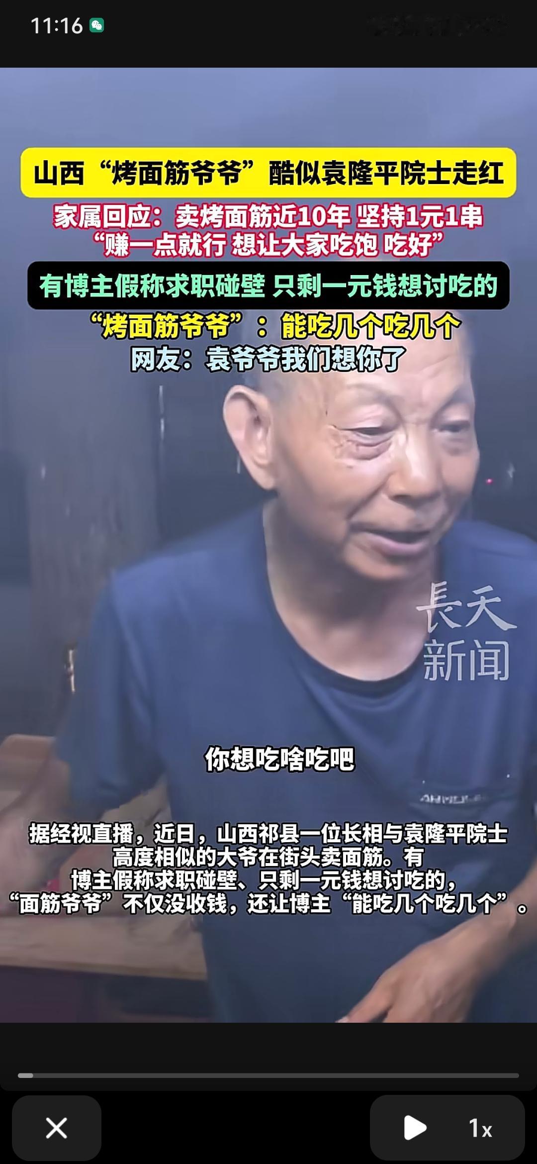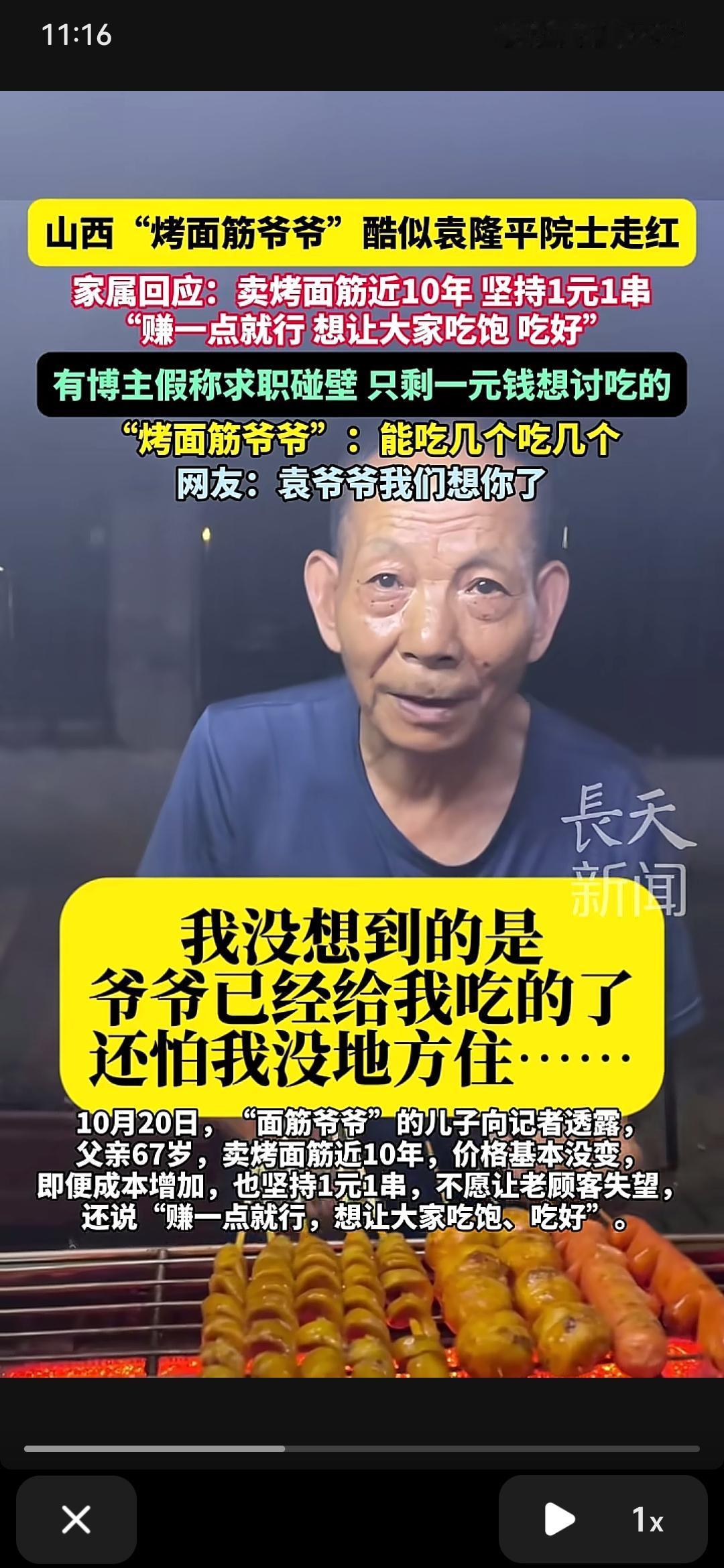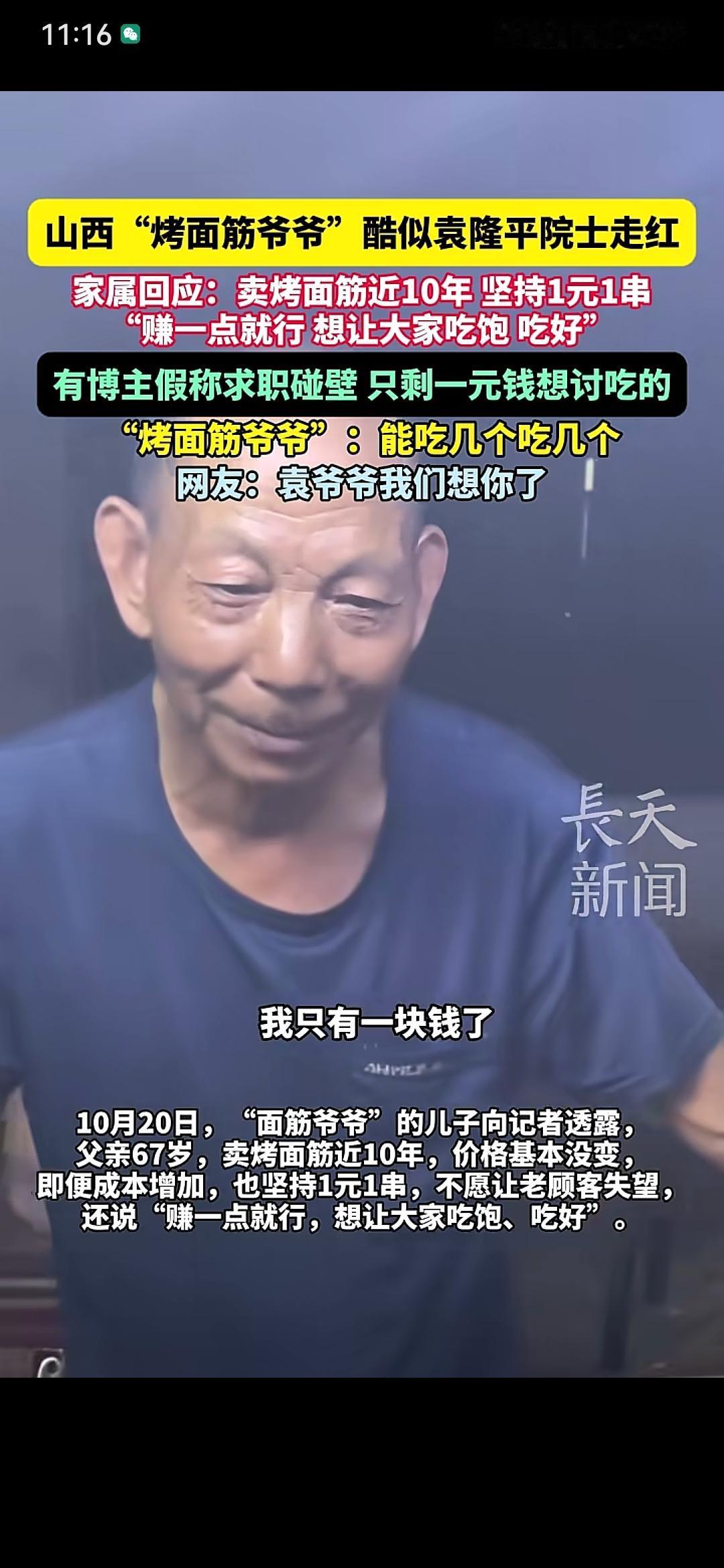 山西“烤面筋大爷” 神似袁隆平爷爷 我第一眼看见这大爷,第一眼就感觉像是袁隆平爷爷,面目慈善和蔼,感觉袁隆平爷爷还没有走 看到大爷的举动,我更加感动,网友就一块钱了,问爷爷能吃啥,大爷回答想吃啥就吃啥,而后更是给网友一大把烤面筋,还贴心的问网友有没有地方住 这一刻,我感觉袁隆平爷爷没有走,就在我们身边…[玫瑰][玫瑰][玫瑰] 大家觉得像吗?