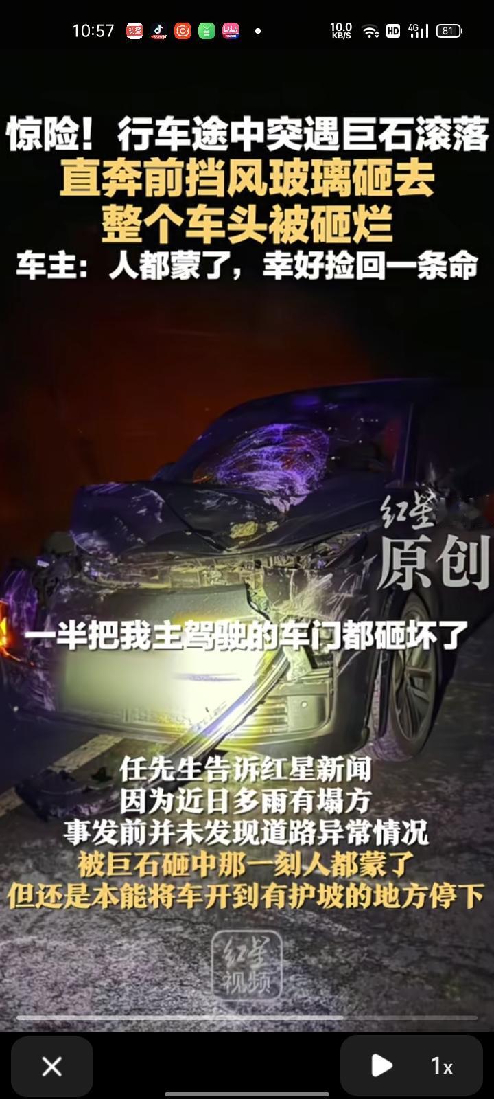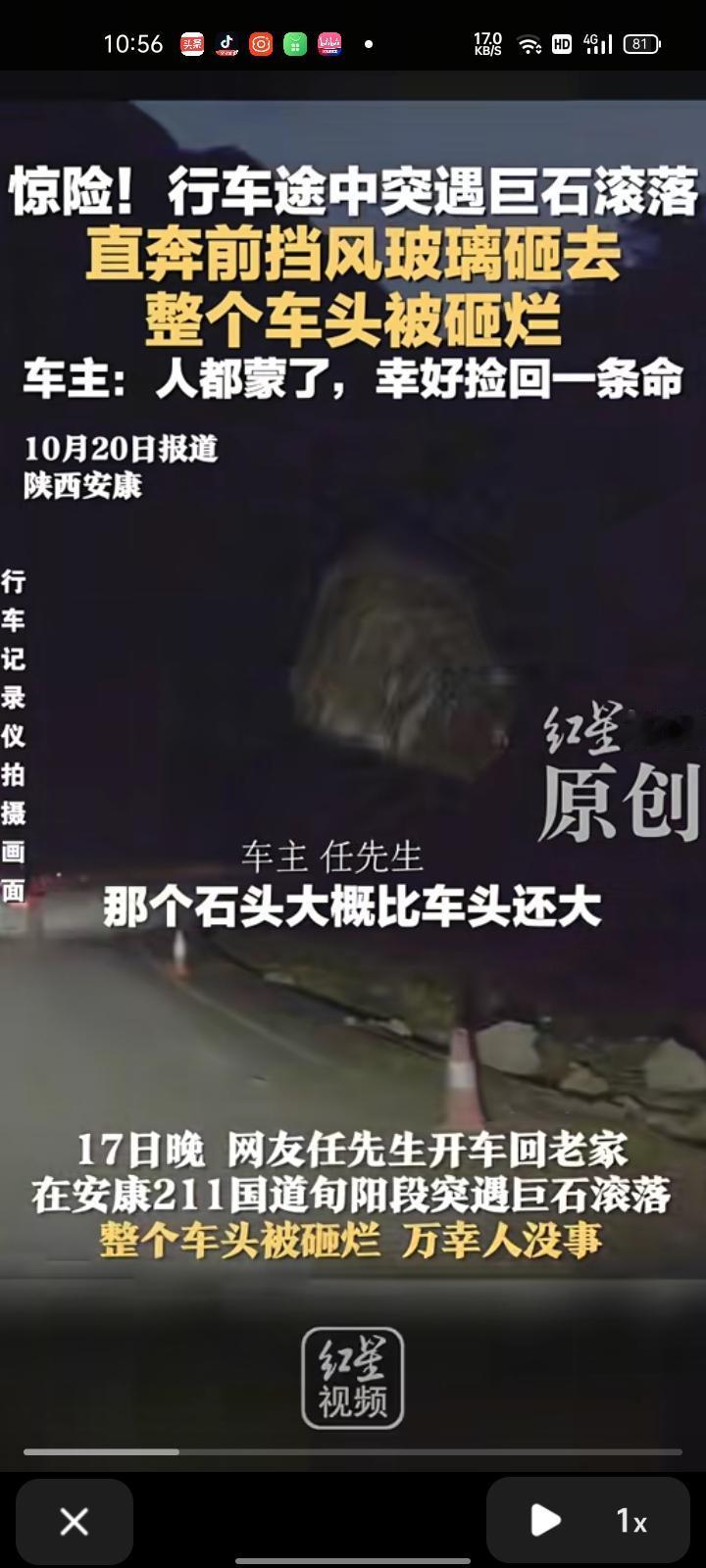 10月17日,安康旬阳市。任先生开车回老家时,途中遇到一块巨石滚落,石头被砸成两半,一半把主驾驶的车门砸坏,但好在人没事。 任先生介绍,因为近日多雨塌方,事发前并未察觉道路异常情况,被巨石砸中的那一刻人都懵了,但还是本能将车开到有护坡的地方停下。 可以说,这真的是不幸中的万幸。这种突发的塌方和落石完全没有预警,能及时反应并安全停下已经很不容易了。 不过也提醒大家,雨季走山区公路一定要多加留意路况,注意观察山体、落石标志,尽量避免在大雨或雨后立即通行危险路段。