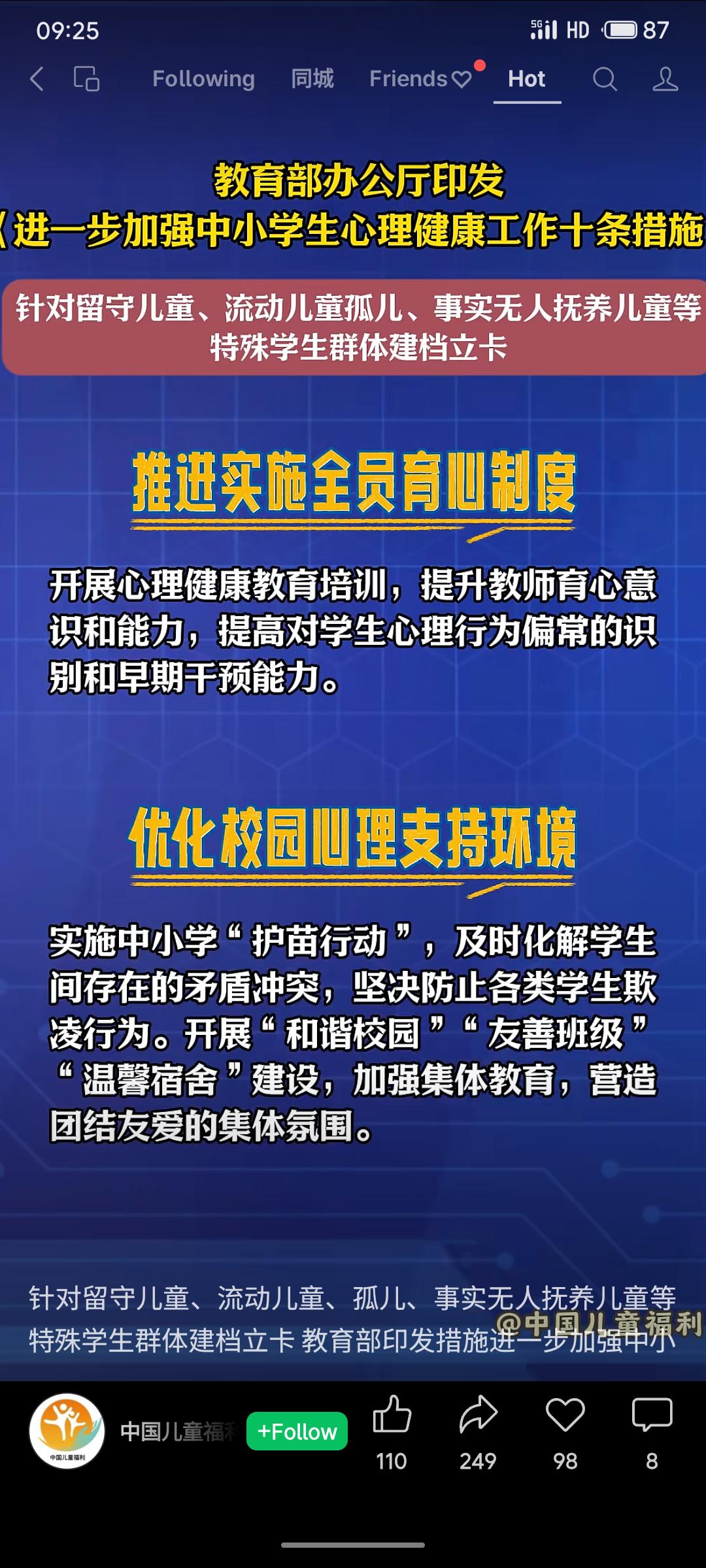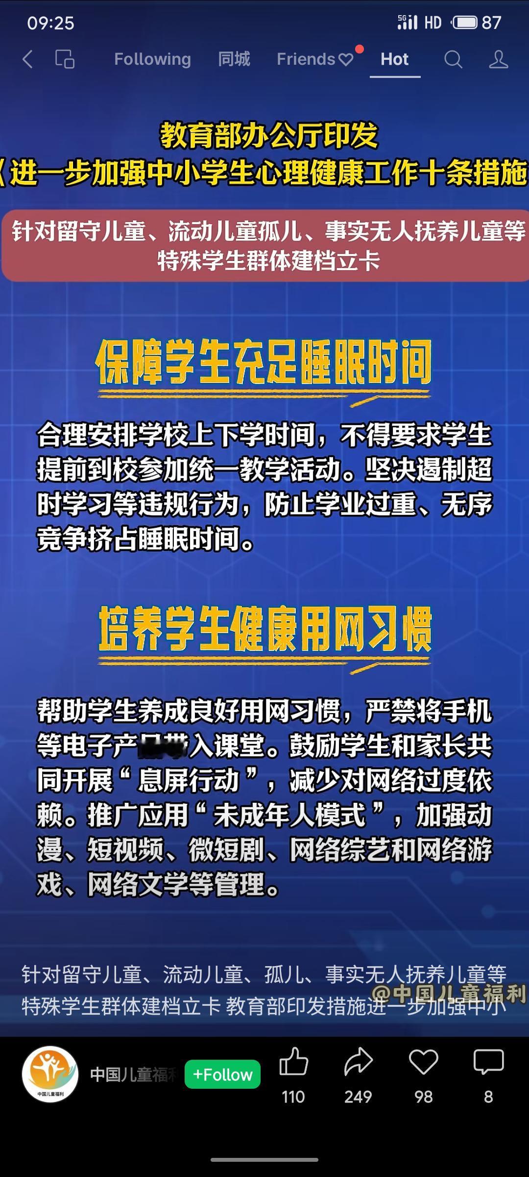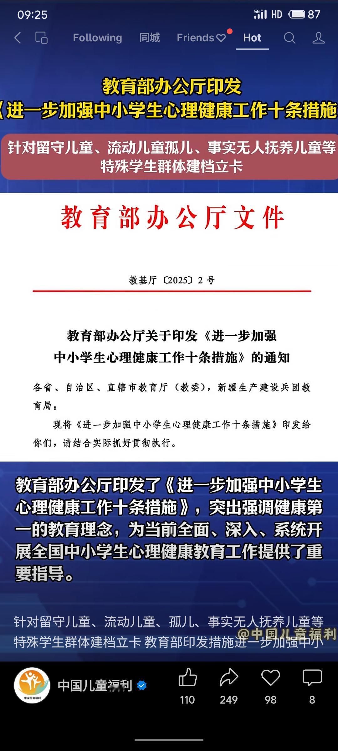 教育部2025年印发《进一步加强中小学生心理健康工作十条措施》,系统部署中小学生心理健康工作。措施突出“健康第一”理念,聚焦减轻学生过重作业负担、保障充足睡眠、每天2小时体育活动。针对留守儿童等特殊群体建立“一生一策”关爱档案,推进全员心理培训、建立监测预警系统、深化家校社协同,并严禁手机入课堂,全面构建学生心理健康支持体系。