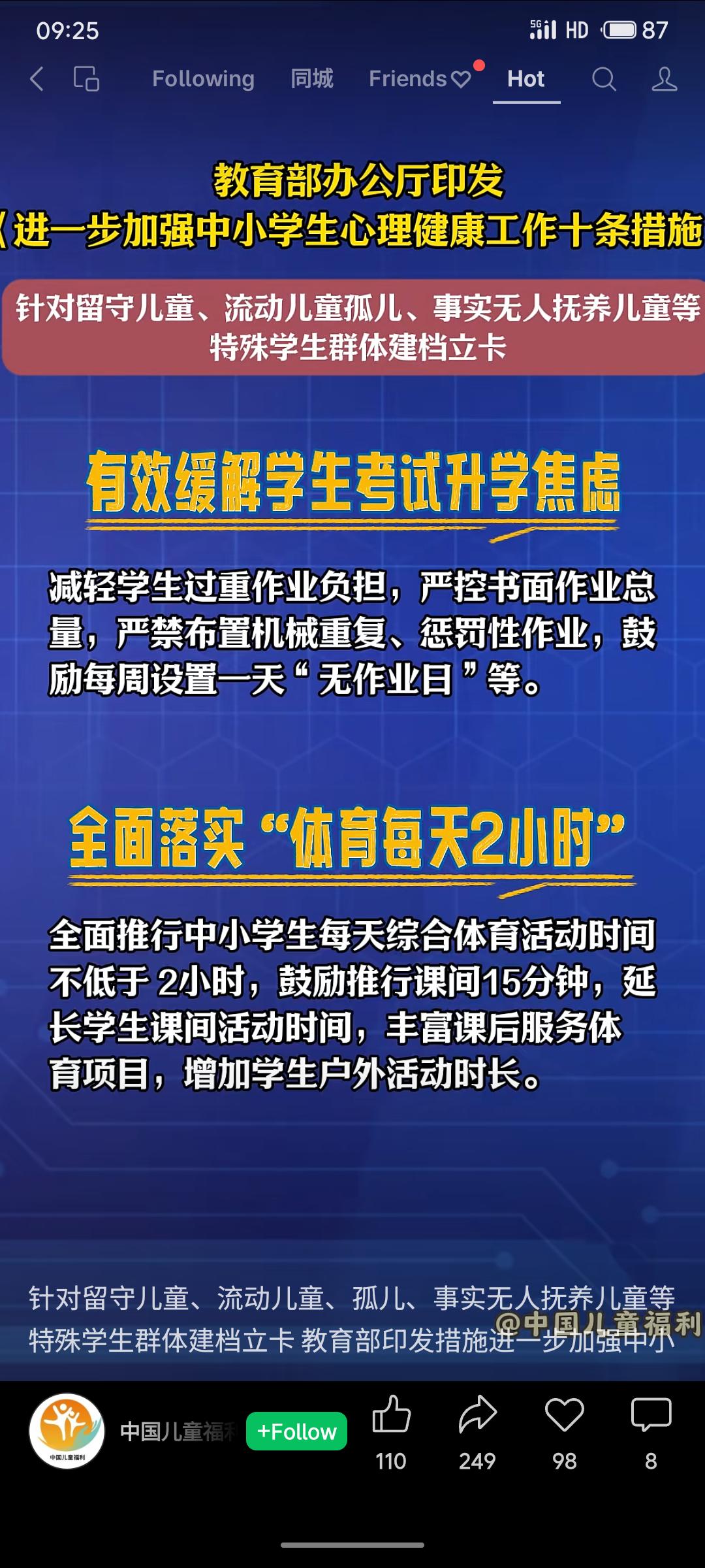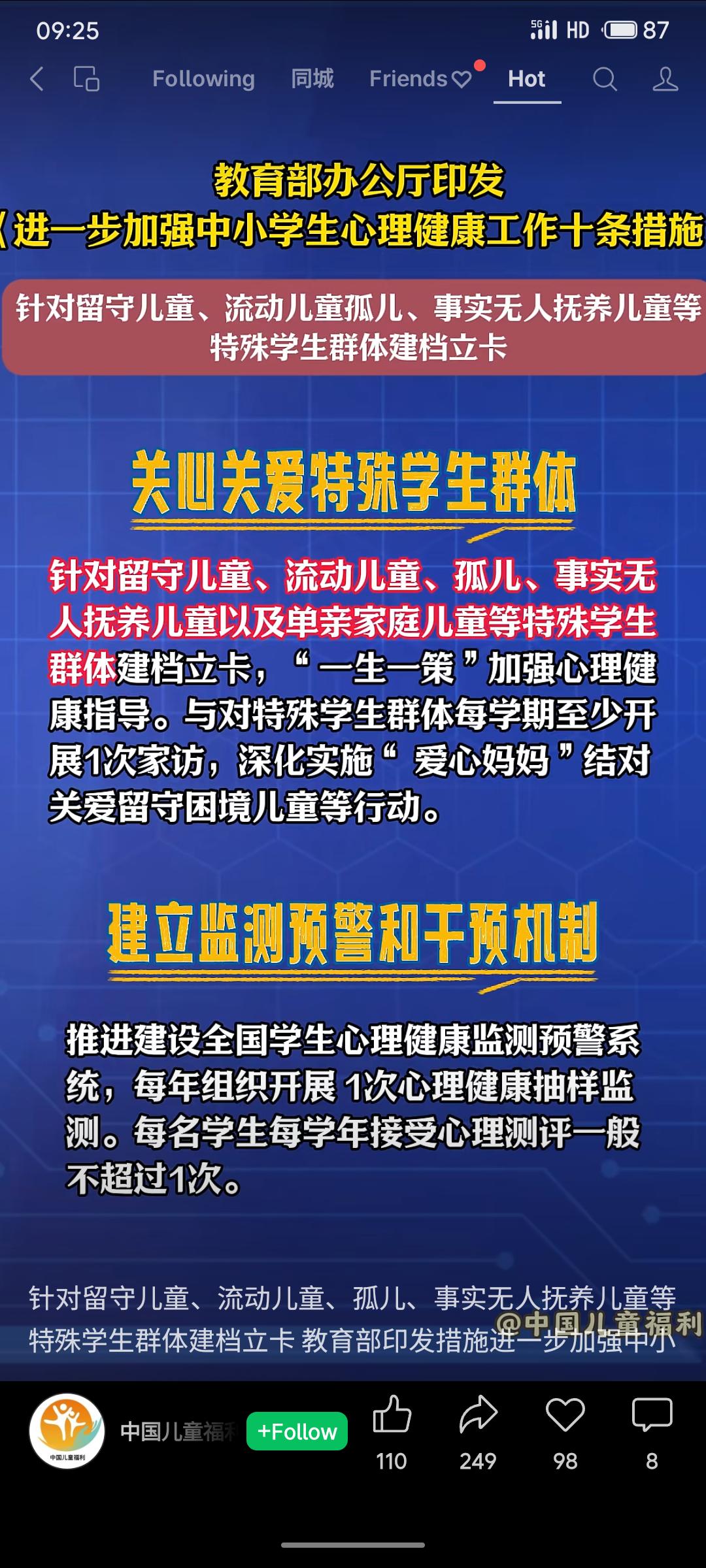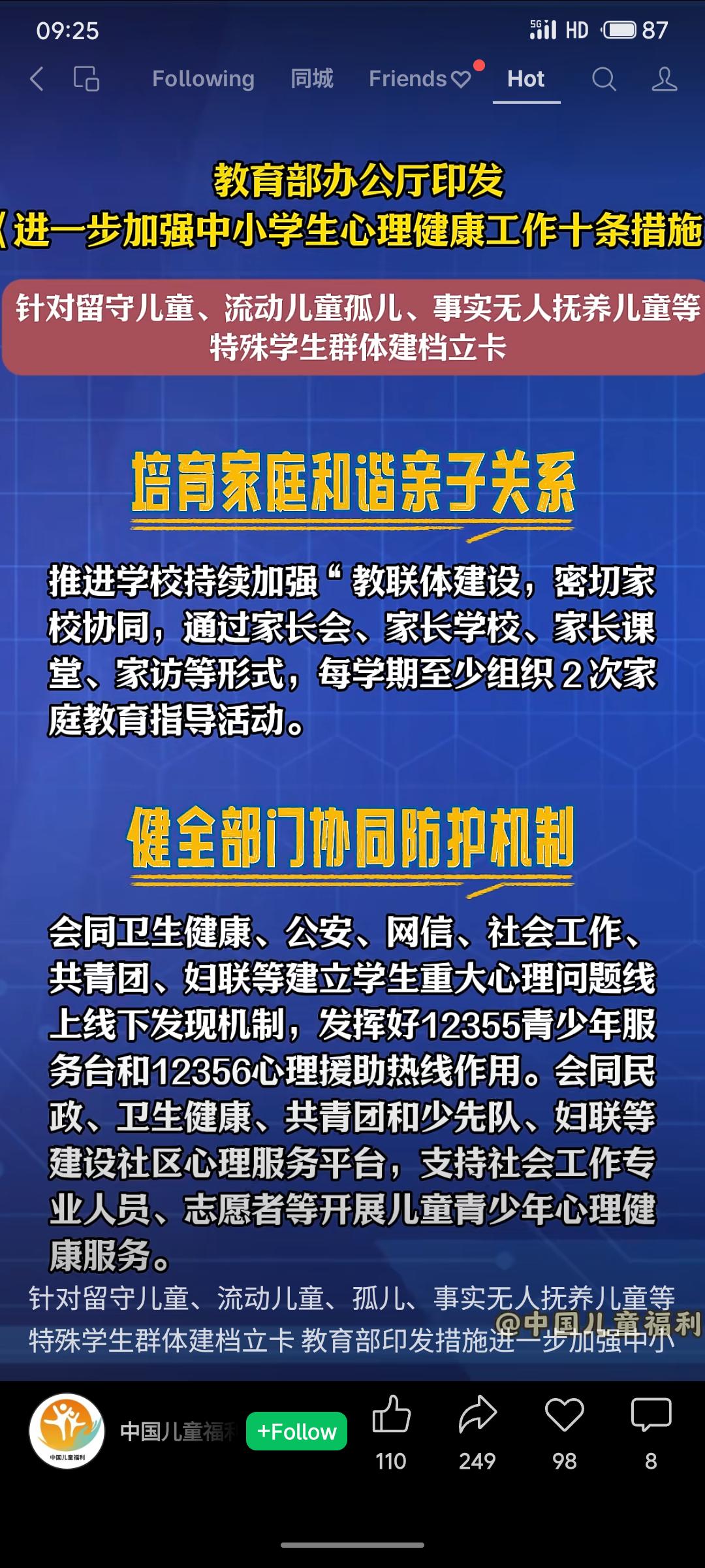 教育部2025年印发《进一步加强中小学生心理健康工作十条措施》,系统部署中小学生心理健康工作。措施突出“健康第一”理念,聚焦减轻学生过重作业负担、保障充足睡眠、每天2小时体育活动。针对留守儿童等特殊群体建立“一生一策”关爱档案,推进全员心理培训、建立监测预警系统、深化家校社协同,并严禁手机入课堂,全面构建学生心理健康支持体系。