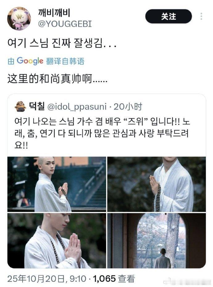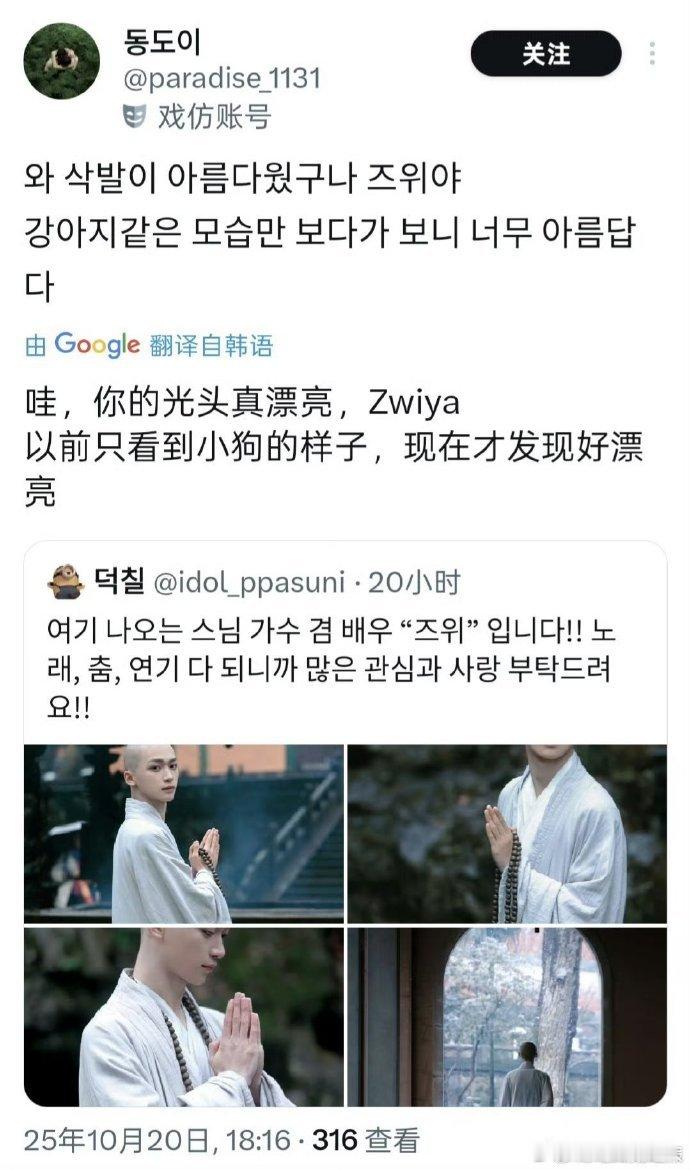 梓渝在韩网被称为寺庙车银优韩网热议梓渝 梓渝凭《盛世天下》光头僧人角色韩红,清俊气质获比车银优,“本命色是光头” 引调侃。