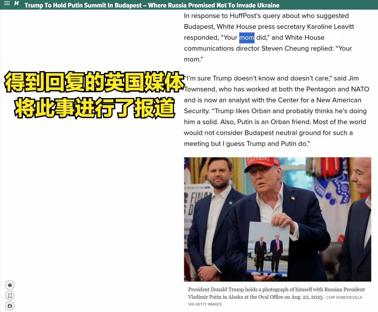 《赫芬顿邮报》记者问:“谁选择了在布达佩斯举行美俄元首会晤?”白宫新闻秘书莱维特回答道,“是你妈决定的。”一分钟后,特朗普政府通讯主任史蒂文·张补充道,“你妈。”记者对此深感震惊,不再敢提出任何问题。 不得不感叹,一群混混掌管着美国,把正常工作机构全关门解散了。所以,草台班子做出任何反常之事都属正常。何止是草台班子这么简单?已经涉嫌人身攻击了!都说霉国是法治社会,看记者怎么治她! 一言一行都是人内心的反射,说的什么话做的什么事,就是什么样的人。物以类聚,人以群分,特不靠谱罪犯总统身边能有什么好人? 大家对此怎么看?欢迎在评论区留言,共同交流探讨!美俄外交会面 美俄外交动态 美俄元首会面 美俄首脑会面 美俄领导人会晤