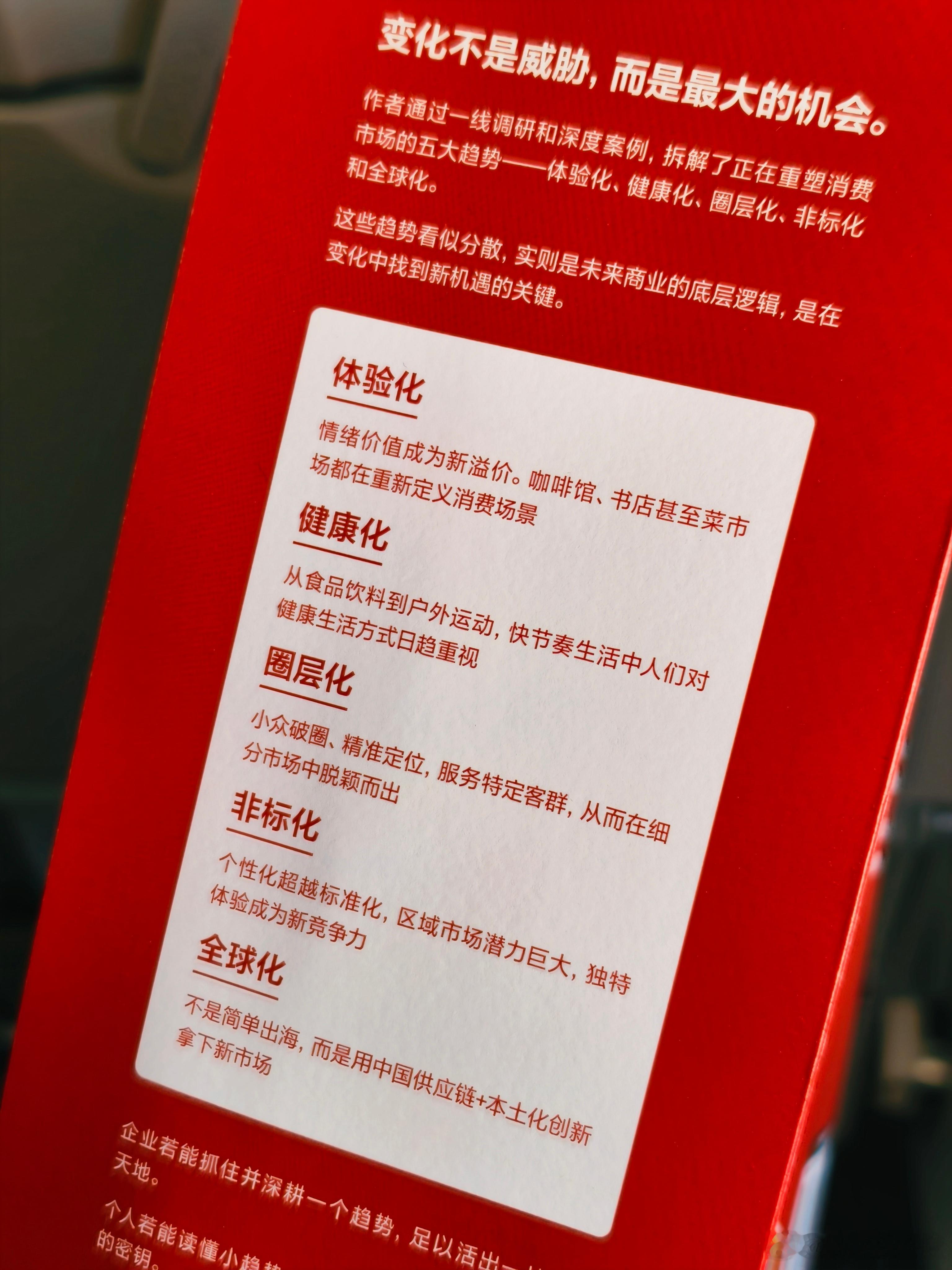 这次出差带的一本书,投资人黄海写的《趋势红利》,具体五大商业趋势:体验化、健康化、圈层化、非标化和全球化。因为大部分内容他播客里面已经阐述过了,所以看的时候有点断断续续。