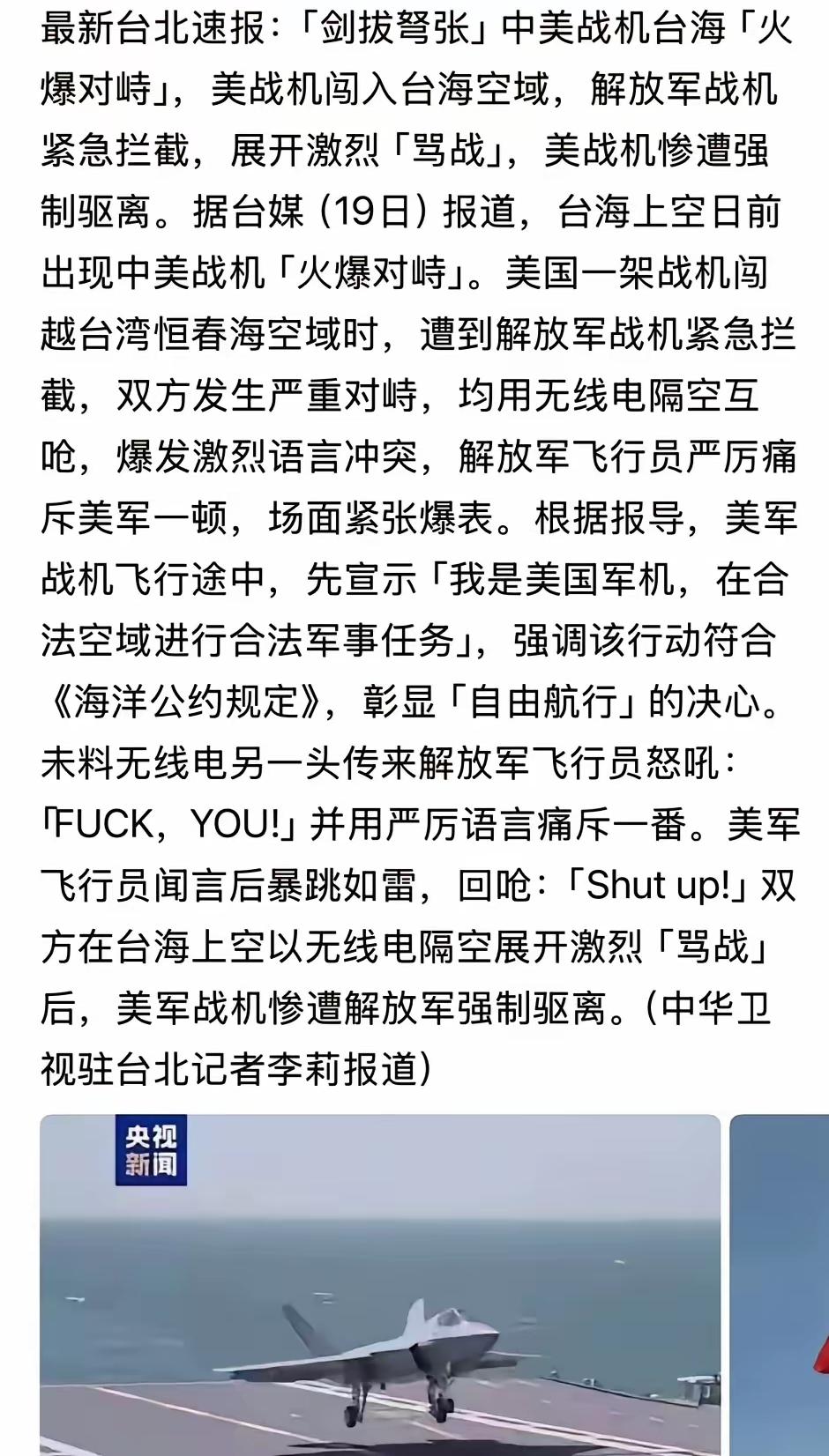 突然觉得英语有点用了。飞行员兄弟们,做好专业动作,别分神儿。骂人这些糙活儿,交给我们广大网友处理。应该问候美军“贷款参军感觉好吗”。中美的飞行员应该不会在空中对骂,因通信频率不完全一样,骂不到一起哎。至于台媒报道出来可能是地面监听广播的无线电发烧友在互呛,台媒的报道出现了错误,有可能在抹黑我们。
