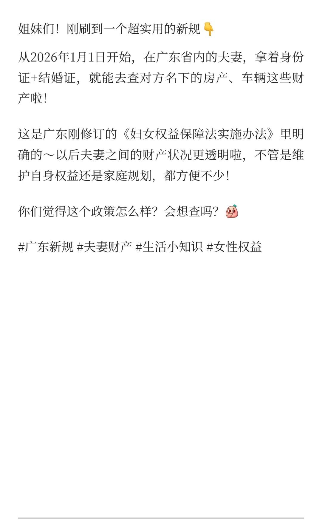 ✨广东夫妻注意!2026年起能查对方财产啦! 从2026年1月1日起,广东省内夫妻凭身份证和结婚证可查询对方名下房产和车辆等财产信息,有助于维护权益和家庭规划,提升财产透明度。