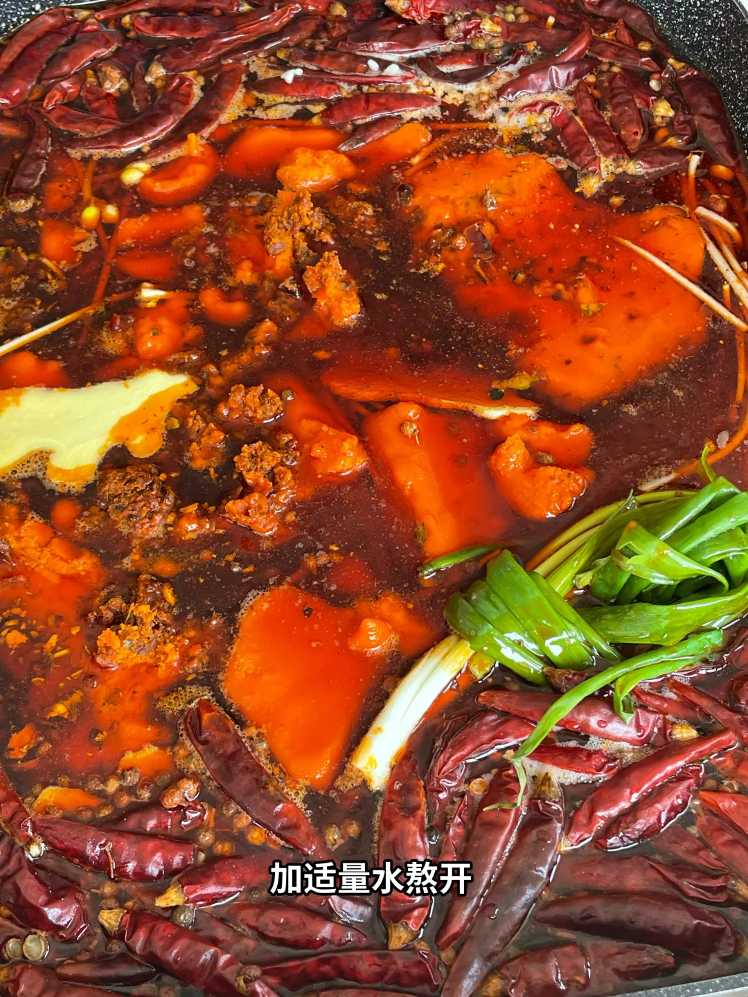 2⃣️然后就来关键的一步就是很重要的锅底,火锅料千千万。我给大家推荐这款远老味的牛油底料。老粉应该知道了,远老味家的钵钵鸡,我是他们家的忠实粉丝,因为他们家的配料表是比较干净。火锅料它有两种,一种是底料,一种是红油,两种一起放进来,锅底再加上适量的辣椒、花椒、姜,两勺醪糟,再来一些葱段。加入适量的盐、水熬开,这就是外面70多的锅底。然后就开始烫自己喜欢的菜,美味火锅就这样简单复刻好了。