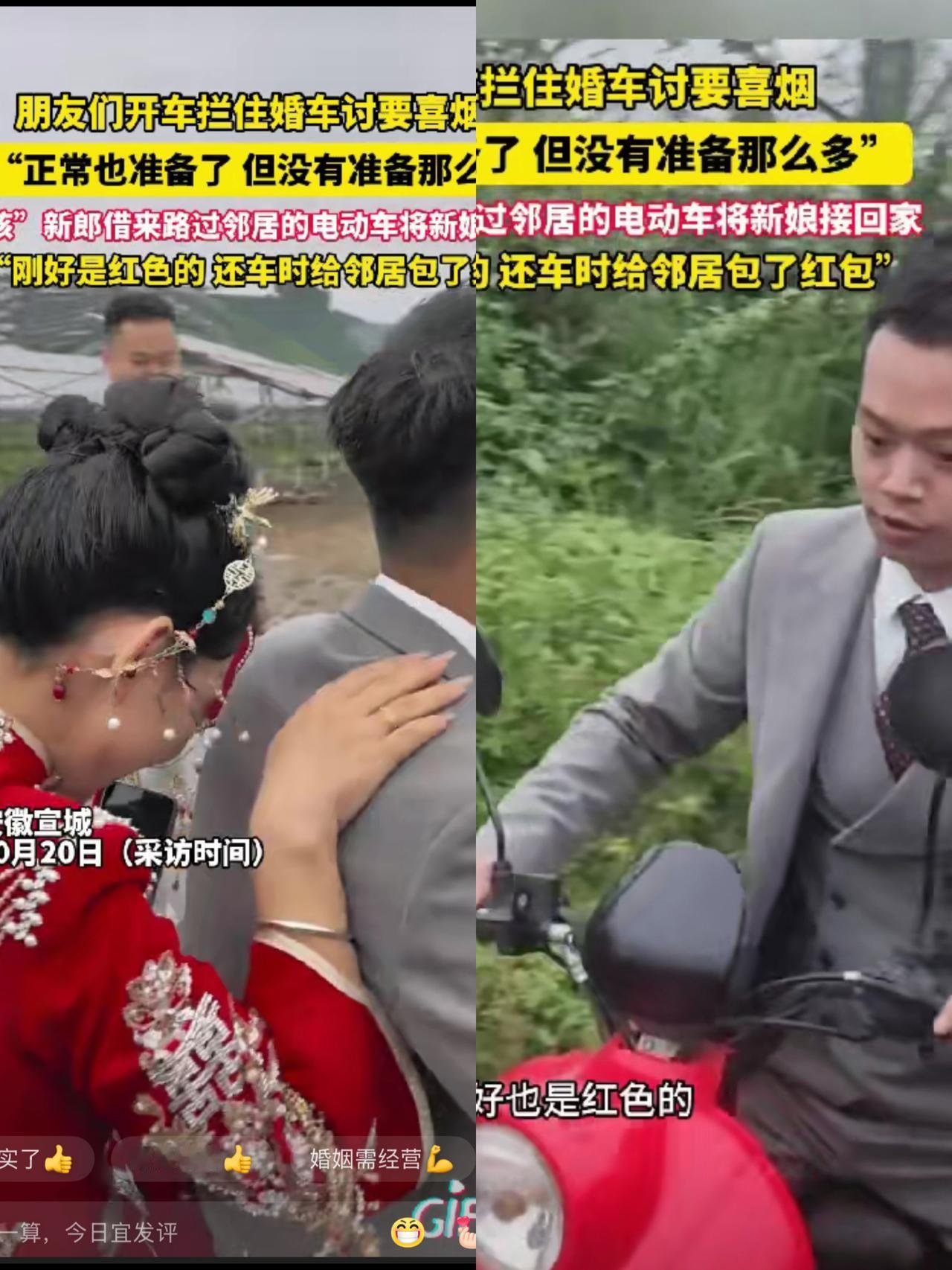 安徽宣城一男子结婚 当天被朋友用车堵住婚车, 要求派烟才让过去,可没想到新郎没有准备那么多喜烟, 万万没有想到,男子接下来直接抢了邻居一辆电动车就带着新娘跑了。 载着新娘就往家冲,新娘还笑得超开心,这剧情比偶像剧还有意思! 其实堵婚车要烟本是图个热闹,可要是没分寸就变添堵了。这新郎聪明就聪明在不纠结,还借到红电动车,连老天都帮衬! 事后给邻居包大红包,也看得出来人靠谱。比起那些为堵门闹僵的,这对新人的相处模式才叫舒服! 有网友说: “这一对必须白头到老,新娘很开心没有娇气没走下车费。” 对此,你怎么看?