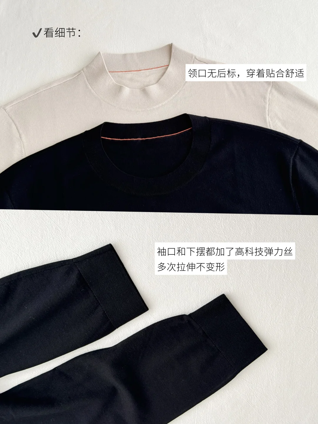 看细节:领口无后标设计,让穿着更舒适。袖口和下摆都加入了高科技弹力丝,久穿也不易散坠