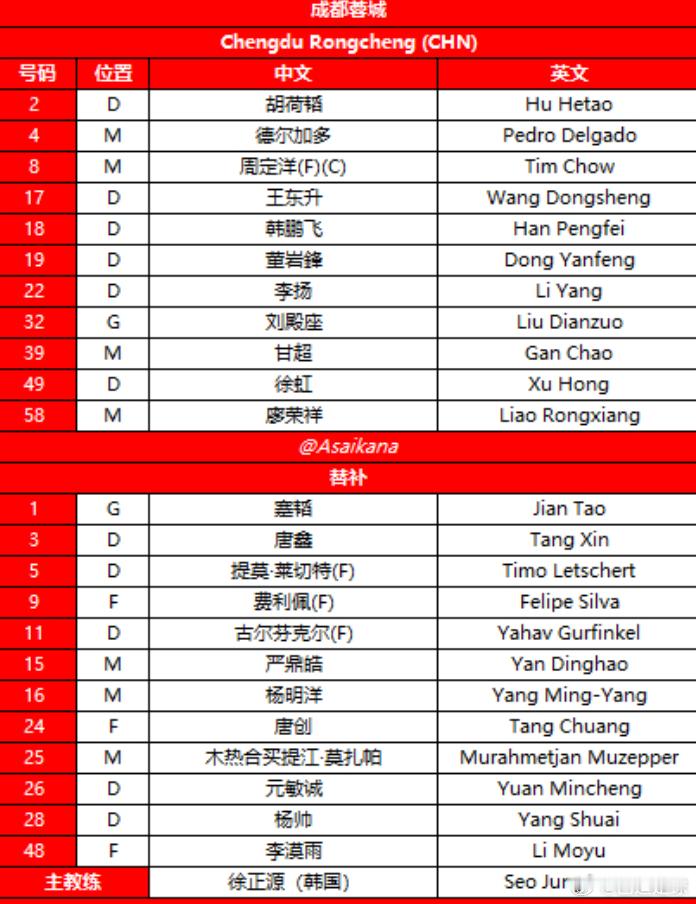 成都蓉城“全华班”出战柔佛新山,常规主力只有周定洋、胡荷韬和李扬,以及守门员刘殿座,其余都是轮换阵容中的球员。