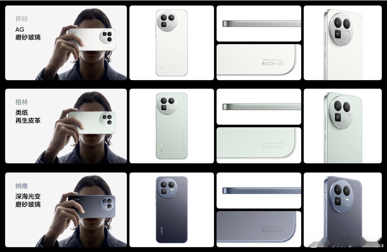 除真我GT8 Pro同款类纸再生皮革「格林」、AG磨砂玻璃「怀特」配色外,还带来采用最新AG玻璃工艺的「纳维」,随光线变换产生深蓝色和浅灰色的自然交替