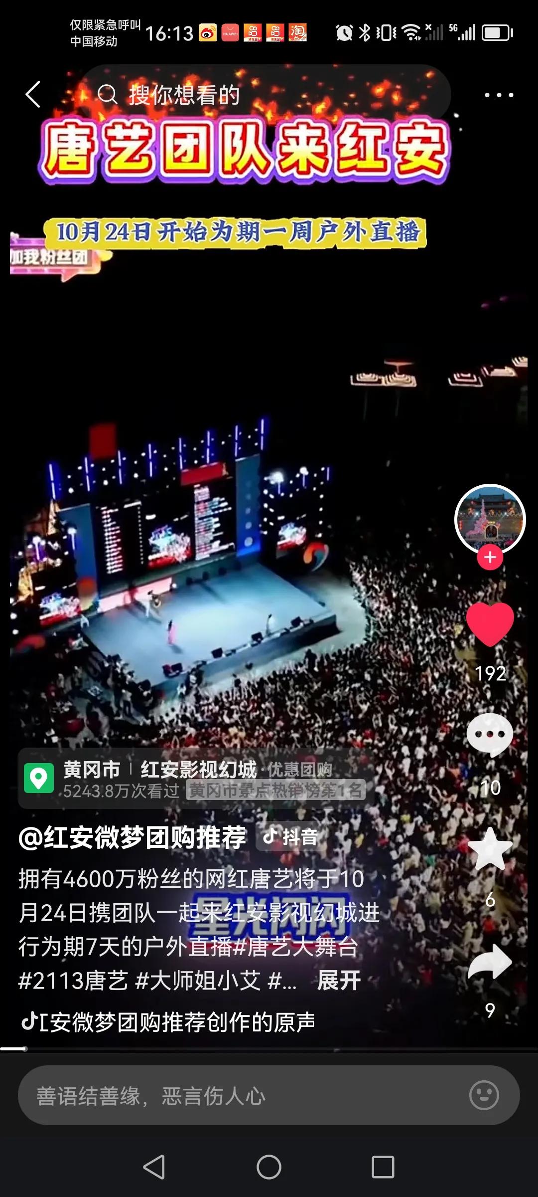 拥有4685万粉丝的户外直播一姐 将于本月24号到30号被邀到湖北红安演出户外直播。这也是唐艺第二次来到英雄之城的红安了,而且这次是在红安的影城景区里面,这几天湖北红安的融媒体官方及文旅各方都在网络上推荐门票,因为是在景区内演出,所以是需要门票的,抖音官方及红安当地融媒体推广方门票为27.8元每张,唐艺以前基本都是没有门票一说,但是这次是在本来就是收门票的景区内,应该到时候也是很多的现场观众,而且唐艺的直播演唱会活动很多的全国各地粉丝都是线上观看的,在今年年底前唐艺的粉丝应该会突破5千万了。靠努力实力赢得了全国各地的粉丝,而且光在抖音都是5年多了,所以说没有谁是随随便便成功的。以上仅供参考,湖南女声音唐艺 唐艺直播间