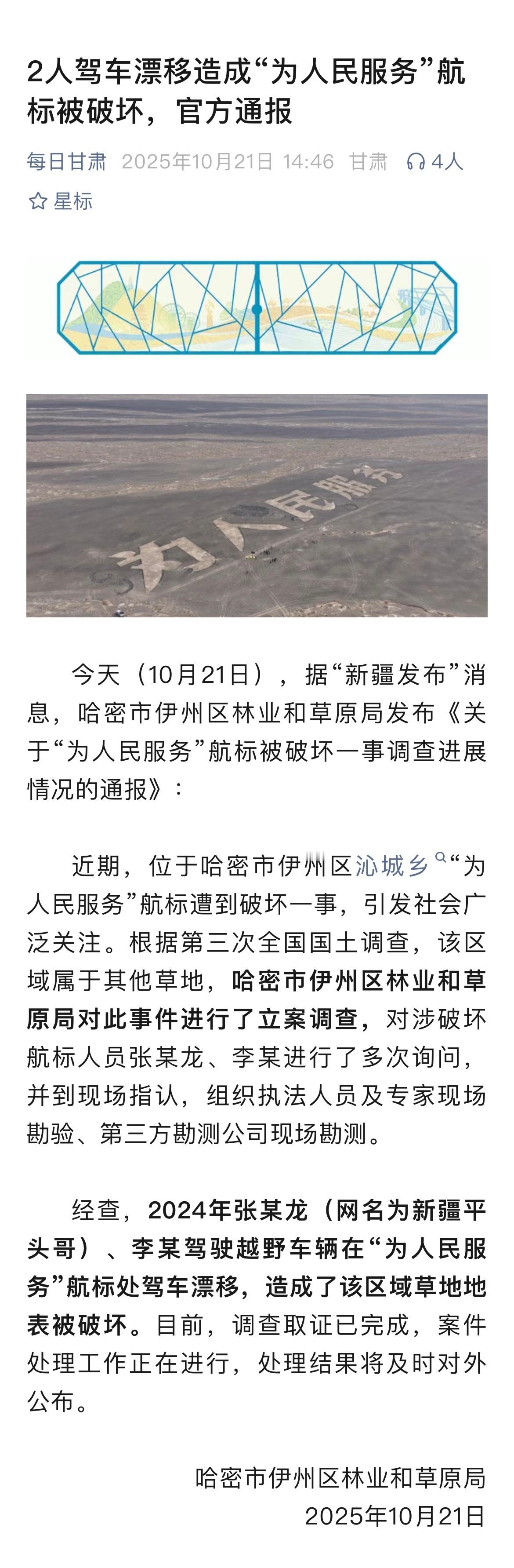 官方通报:2人驾车漂移造成“为人民服务”航标被破坏,已立案调查。[话筒]官方通报