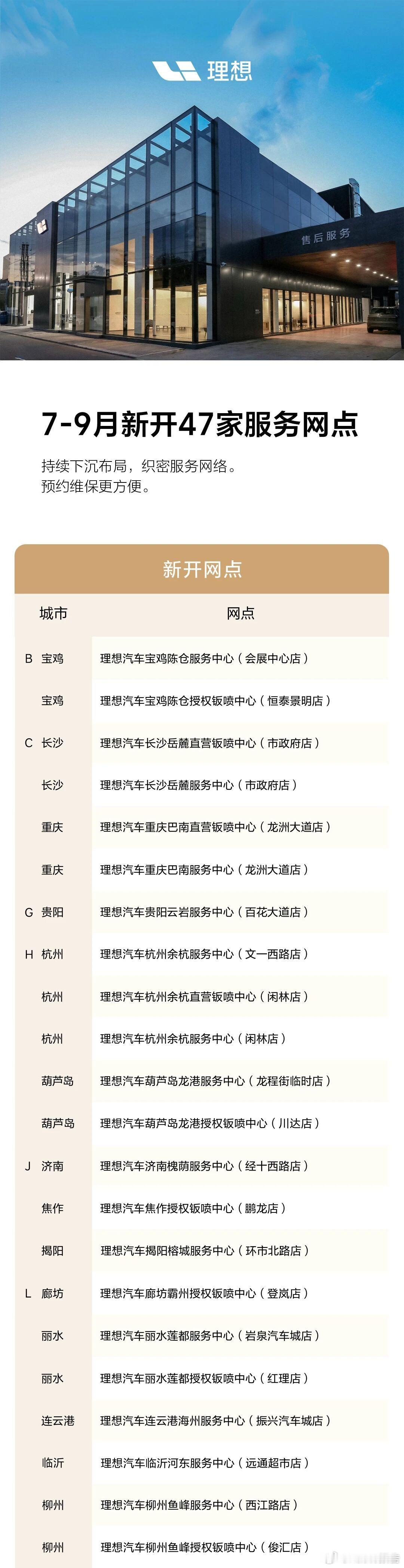 理想汽车7月-9月新增47家服务网点