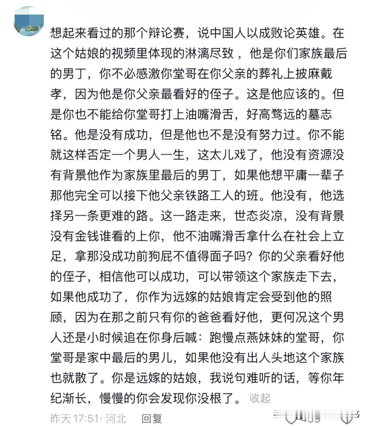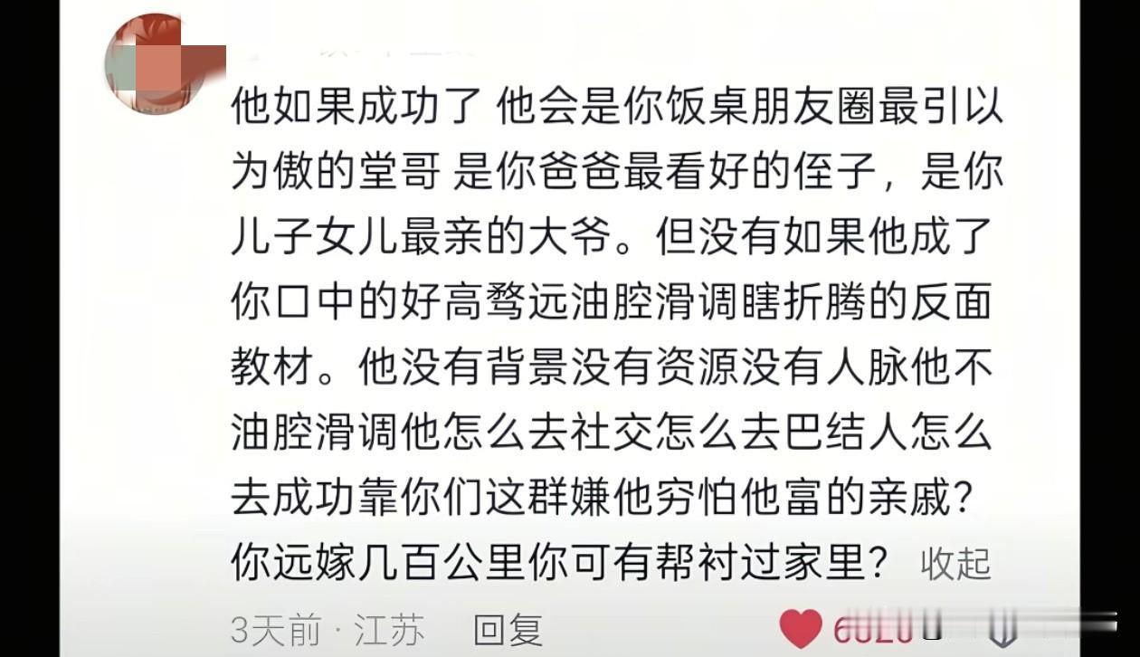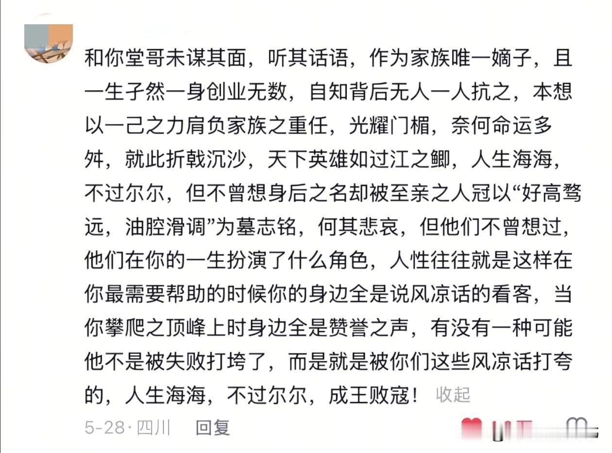 49岁堂哥的墓志铭是可笑的“好高骛远”,四个字成了钉在其棺材板的耻辱钉。亲戚们把他失败全归为性格缺陷,却忽略了他作为独子面对的传统压力。那张油嘴滑舌的表皮下面,完全是不一样的心思,试问,一个没有家庭背景的素人想要成功,他需要付出的绝不是简单的“油嘴滑舌”,但却是必经路,很残酷的现实,但就是如此,就像学拳一样,要先学挨打。 还有个很残酷的时间点,他是在唯一支持者去世三年后脑瘀血走的。这绝非巧合,从认知理学来说,失去重要情感支柱的3-5年是心理崩溃高发期。那么,当他失去最后的精神锚点,或者说精神支持,他的努力又迟迟得不到正向回馈,是非常煎熬的。更讽刺的是,亲戚们用“混日子”定性他的人生。而家族评价体系对中年男性的伤害值,是陌生人的7.2倍。那些茶余饭后的“私下讨论”,本质上就是软性暴力。 看数据就知道:35-49岁男性创业失败率超八成。他恰在49岁这个临界点倒下,更像是被“光宗耀祖”的传统期待压垮的。当所有人只盯着他“啃老”的结果,却忽略了他努力的过程。 成王败寇的叙事铁律,从来比我们想象的更荒诞。