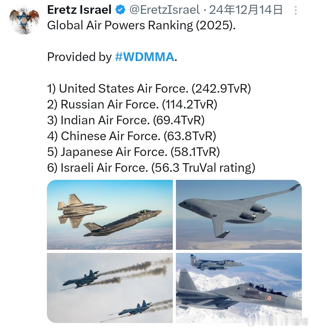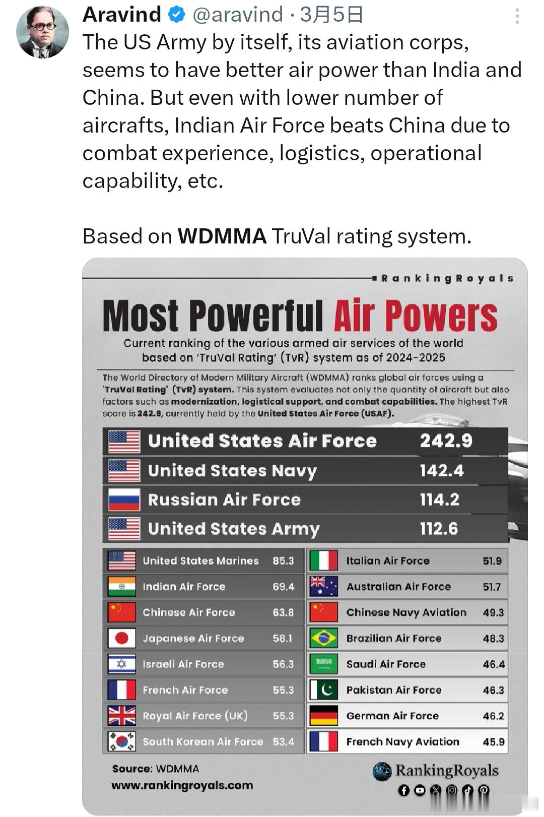 WDMMA年度排名采用的公式考虑了与世界各航空服务的总战斗力相关的值。该公式产生TruVal评级 (TVR),有助于根据 - 不仅是整体实力 - 而且是现代化、后勤支持、攻击和防御能力等来明确区分每个力量。这样,评估一个大国的不仅仅是其飞机总量,而是评估其质量和库存的总体组合。对一些大国通常忽视的类别给予了更大的权重,即特种任务、专用轰炸机部队、CAS、训练和命令部队。除此之外,还关注当地航空工业能力、库存平衡和部队经验。