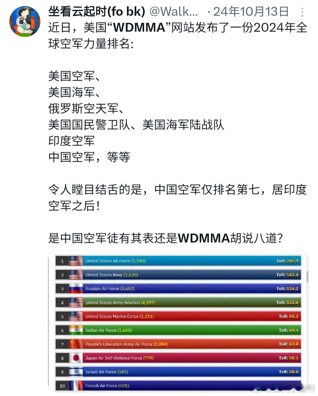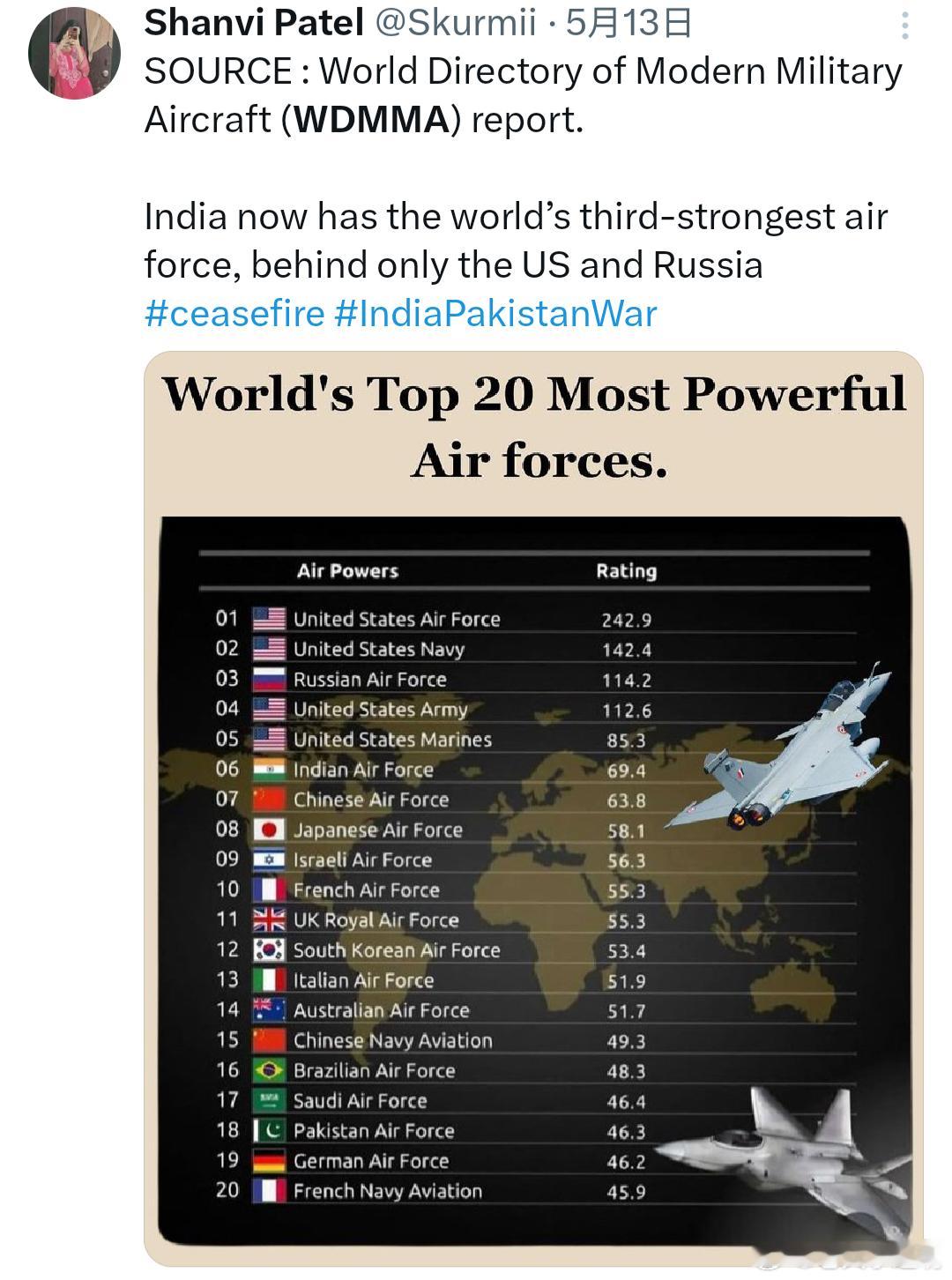 中国航空工业能力和空军五代机歼-20却被美国智库忽视了,无人机也没有作为考量空军实力的一个指标。我认为不必在意这个排名,印度人高兴就让他们高兴高兴也好,我们继续按部就班建设我们的空军。空军[超话]