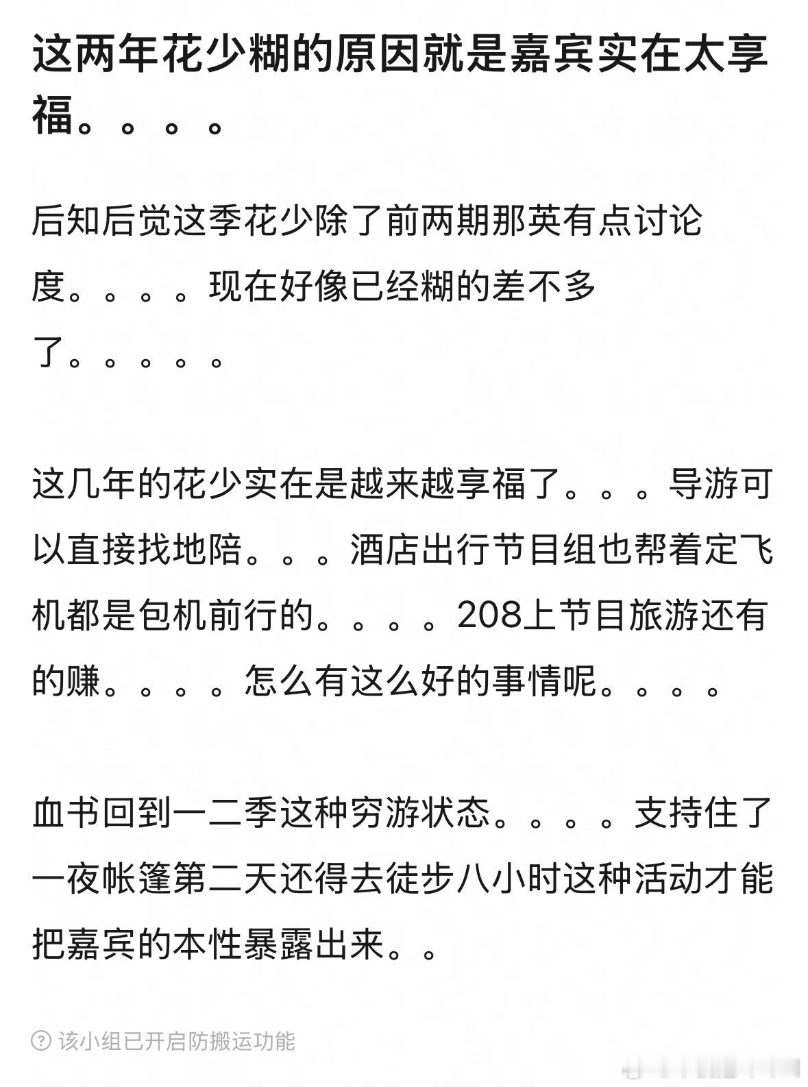 网友说花少糊的原因是这几年越来越享福了,导游可以直接找地陪,酒店出行节目组也帮着定飞机都是包机前行的,星海回到一二季这种穷游状态,住了一夜帐篷第二天还得去徒步八小时这种…..