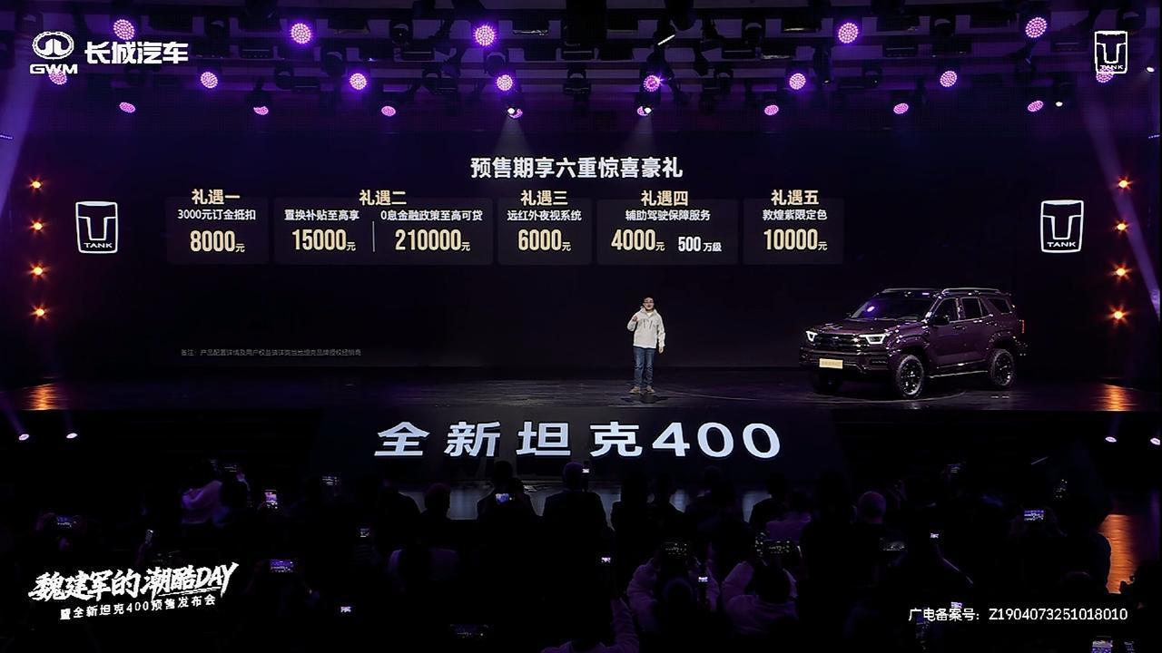 全新坦克400价格公布: Hi4Z 智享版:32.98万元 Hi4T 智享版:30.98万元 跟价格相关的优惠有两个: 礼遇一:3000元订金抵扣8000元。相当于优惠5000元。 礼遇二:置换补贴至高享15000元,或0息金融政策至高可贷210000元。大概估算一下,相当于优惠15000元左右。 以上两者加起来,总计相当于优惠20000元! 结合官方售价,可得出全新坦克400的实际价格为: Hi4Z 智享版:30.98万元 Hi4T 智享版:28.98万元 这个价格,各位觉得怎么样? 全新坦克400长城汽车懂车帝车友圈魏建军能否带领长城汽车翻身坦克400 新手上路,定期更新! 劳烦关注,一定回关!
