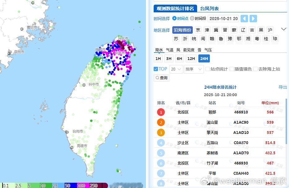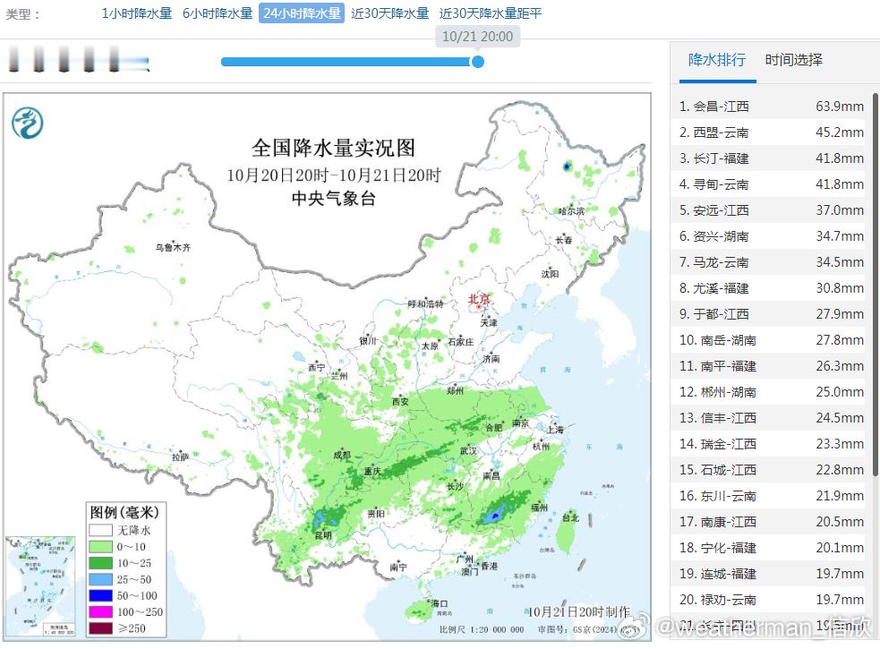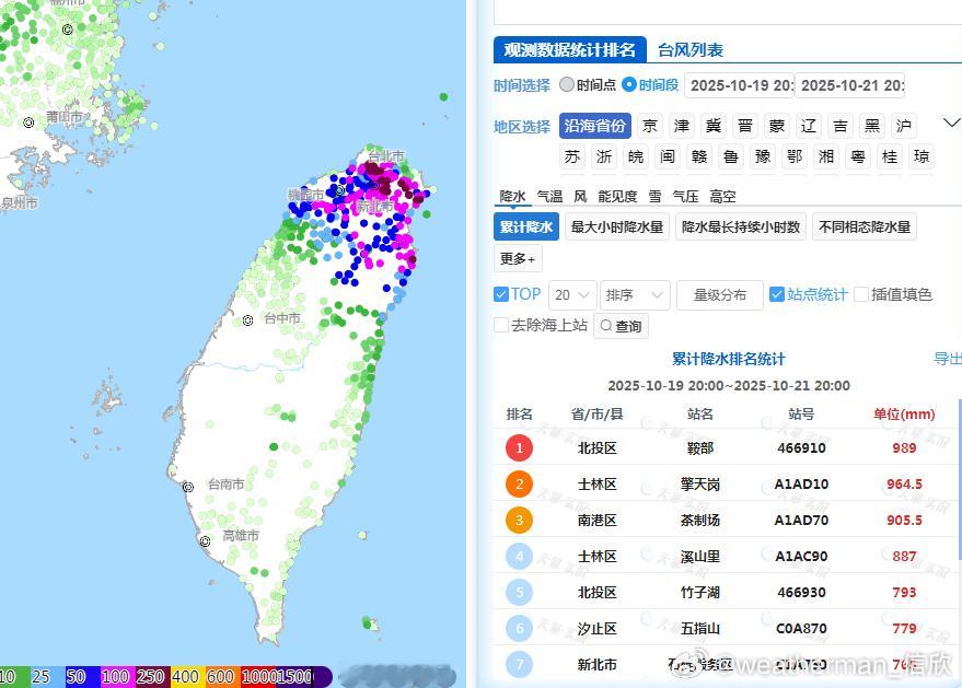 【降水】昨晚到今天,南方的降雨范围依然不小,江西会昌出现了63.9毫米的暴雨,打破当地10月下旬单日降水量纪录。台湾北部因为台风风神的环流+冷空气影响以及地形抬升作用,出现特大暴雨。鞍部24小时降水量566毫米,19日20时-21日20时,48小时雨量989毫米。
