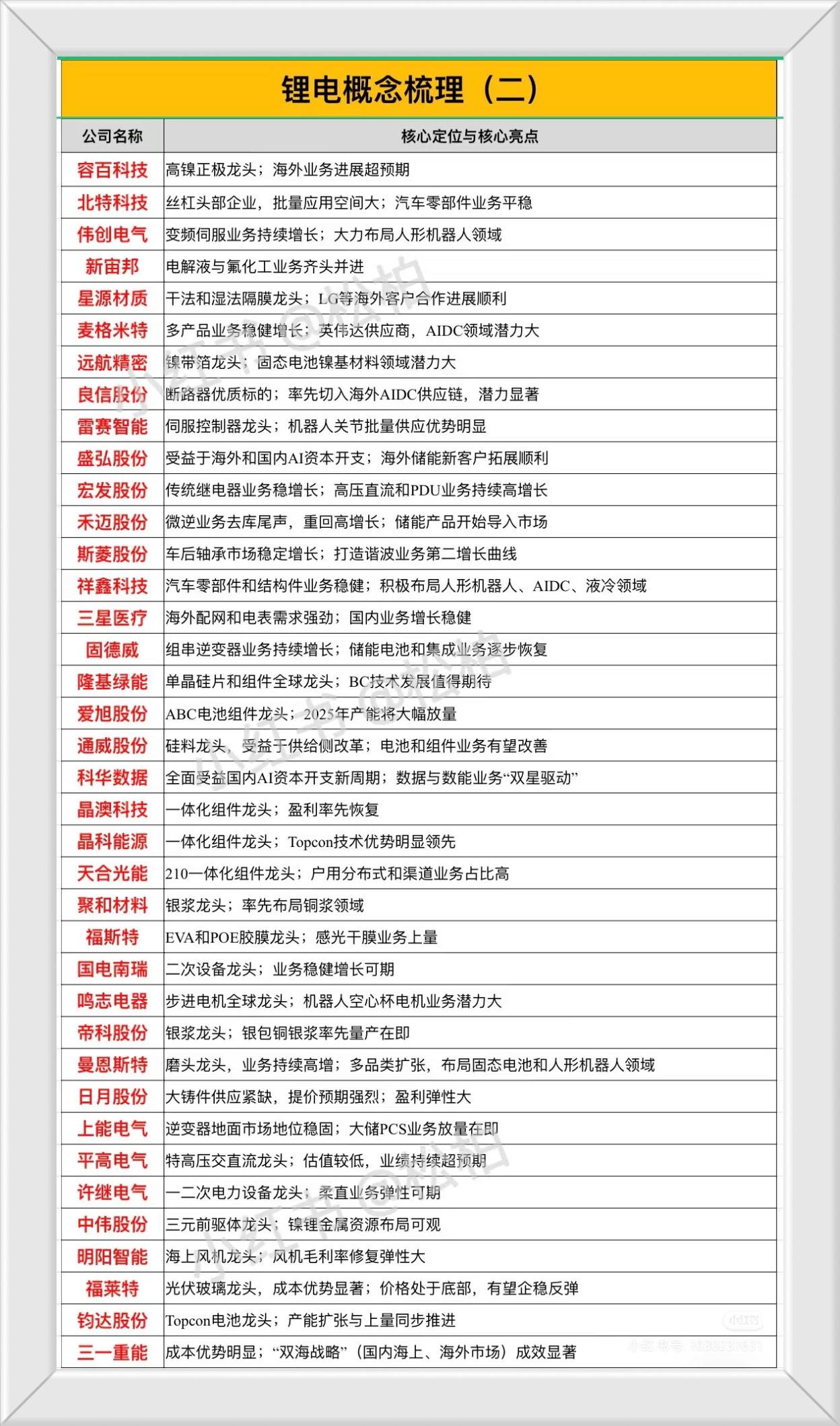 “锂电概念梳理”,以下列出了多家在锂电、储能、光伏、风电、新能源汽车、电力设备、机器人、充电桩等领域具有核心竞争力和业务亮点的代表性企业,并简要总结了每家公司的核心定位与突出优势。 第一张图(锂电概念梳理一)涵盖的企业包括: - 动力电池与储能领域:如宁德时代(全球动力&储能电池龙头,盈利强、估值低)、亿纬锂能(动力&储能锂电上量,消费电池稳健)、比亚迪(电动车销量持续增长,智驾技术领先)、欣旺达(消费与动力储能锂电业务增长在即)等。 - 关键材料与部件:如湖南裕能(铁锂正极龙头,高端产品供需紧俏)、天赐材料(电解液与六氟磷酸锂龙头,新型锂盐技术先进)、当升科技(三元正极龙头,固态电解质领先)、厦钨新能(钴酸锂盈利向好,布局硫化锂)、容百科技(高镍正极龙头,海外业务佳)、中伟股份(三元前驱体龙头,资源布局广)等。 - 热管理与零部件:如三花智控(热管理全球龙头,涉足特斯拉机器人)、科达利(结构件全球龙头,人形机器人零部件潜力大)、震裕科技(结构件盈利修复,拓展机器人关节总成)、斯菱股份(布局谐波业务)等。 - 设备与工艺:如璞泰来(负极龙头,隔膜涂覆与固态电池设备技术先进)、纳科诺尔(干法设备龙头,布局固态电池设备)、曼恩斯特(磨头龙头,涉足固态电池与人形机器人)等。 - 储能系统与集成:如海博思创(国内大储龙头,积极拓展海外)、阳光电源(逆变器与储能集成全球龙头,切入AIDC)、固德威(组串逆变器增长,储能业务恢复)、锦浪科技(欧洲市场回暖,新兴市场增长)、上能电气(逆变器地面市场稳固,大储业务放量)等。 - 其他领域:如金风科技(风机与风电运营)、天合光能/晶澳科技/晶科能源/隆基绿能(光伏组件龙头,技术各具优势)、东方电缆(海缆龙头,海风业务增长)、大金重工(海风出口优势明显)、三星医疗(海外电力需求强劲)、福斯特(胶膜龙头,感光干膜增长)、福莱特(光伏玻璃龙头,价格见底)、钧达股份(Topcon电池产能扩张)等。 第二张图(锂电概念梳理二)进一步补充了更多细分领域的代表性企业,包括: - 正极与材料:如容百科技(高镍正极,海外进展好)、当升科技(三元正极)、中伟股份(三元前驱体)、厦钨新能(钴酸锂与硫化锂)等。 - 电解液与氟化工:如新宙邦(电解液与氟化工并进)、天赐材料(电解液龙头)等。 - 隔膜:如星源材质(干湿法隔膜龙头,海外客户合作佳)。 - 零部件与机器人:如三花智控、科达利、震裕科技、斯菱股份、鸣志电器(步进电机与空心杯电机潜力大)、伟创电气(布局人形机器人)、雷赛智能(伺服控制器,机器人关节供应优势)等。 - 电力与自动化设备:如汇川技术(通用自动化龙头,联合动力超预期)、国电南瑞(二次设备稳健)、麦格米特(多产品增长,AIDC潜力)、宏发股份(继电器稳增,高压直流高成长)、禾迈股份(微逆去库结束,储能导入)、四方股份(二次设备,SST技术优)、良信股份(断路器优质,切入海外AIDC)等。 - 充电桩与电源:如优优绿能(充电桩模块龙头,布局HVDC)。 - 固态电池相关:如上海洗霸(全面布局固态电池,与有研合作硫化锂)、曼恩斯特(布局固态电池)、天奈科技(碳纳米管龙头,受益于快充/固态电池趋势)等。 - 精密制造与轴承:如北特科技(丝杠头部企业,汽车零部件平稳)、斯菱股份(车后轴承增长,布局谐波)、祥鑫科技(汽车结构件稳健,布局人形机器人/AIDC/液冷)等。 - 光伏与风电:如隆基绿能(单晶硅片与组件全球龙头,BC技术前景好)、爱旭股份(ABC电池2025年放量)、通威股份(硅料龙头,电池组件改善)、晶澳科技/晶科能源/天合光能(一体化组件龙头,技术各异)、明阳智能(海上风机龙头,毛利率修复)、金风科技(风机毛利率回升)、大金重工(海风出口)、日月股份(大铸件提价预期强)等。 - 储能与逆变器:如固德威(储能电池与集成恢复)、锦浪科技(新兴市场增长)、上能电气(大储PCS放量)、阳光电源(全球储能集成龙头)等。 - 其他:如德业股份(户储爆发、工商储蓄势)、艾罗能源(户储龙头,工商储起量)、阿特斯(海外大储收获期)、富临精工(高压实铁锂技术,机器人布局)、东方电缆(海缆高壁垒)、福莱特(光伏玻璃成本优)、福斯特(胶膜与干膜)、许继电气(柔直业务弹性)、平高电气(特高压龙头,估值低)、科华数据(AI资本开支受益,数能双星驱动)等。