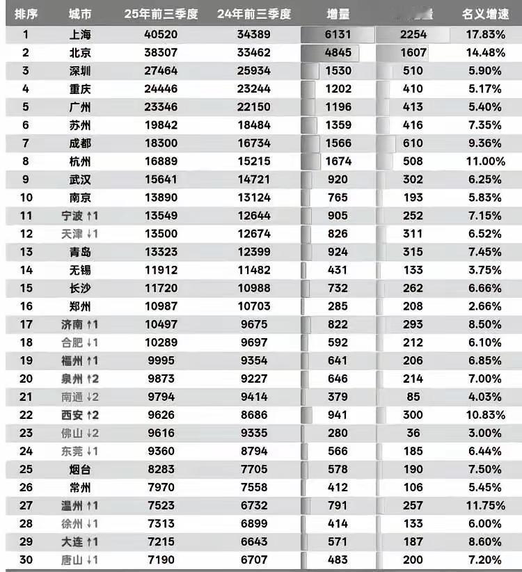 财经 城市 老徐拼了,仍干不过温州。2025年30城市前三季度GDP预测排名,三座冲击万亿级热门城市,徐州排名28,比去年下降1位,而温州列27名,上升1位。而大连排名29,超过己是万亿俱乐部26个正式成员唐山,升格一位。2025年温州、徐州、大连铁定要迈入GDP万亿俱乐部,唐山这个排名,增速,能不能保住万亿级城市的位置,难说的。唐山可不能跌出万亿俱乐部,那大河北真闹笑话了。