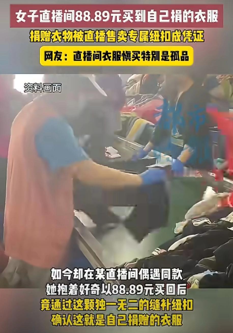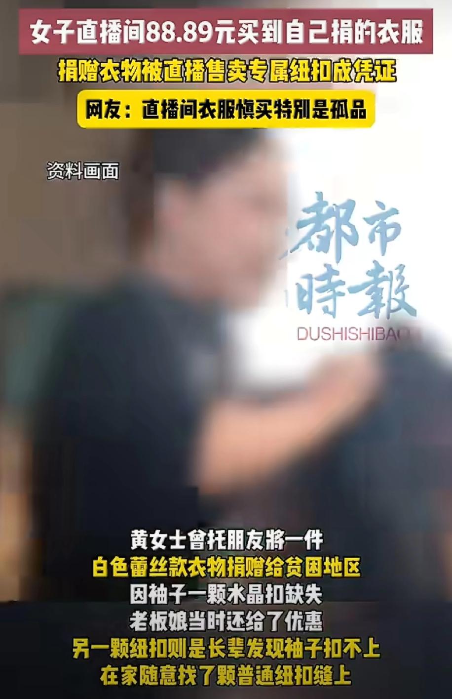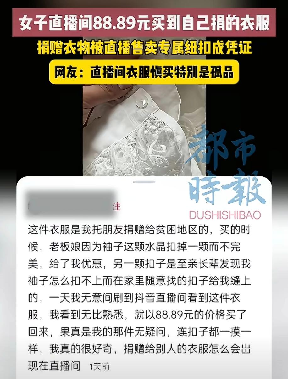 直播间里刷到“眼熟”的蕾丝外套,黄女士手一抖就拍了,88块8毛9,图个乐。拆开快递那一刻,她直接傻眼:左袖口缺颗水晶扣,右袖口歪七扭八缝着一颗塑料圆扣——那正是她半年前亲手捐出去的“白月光”。 事情得从头捋。春天大扫除,她把闲置衣物打包托朋友送到旧衣回收站,老板娘看蕾丝勾了丝、水晶扣掉一颗,主动给减了价,她也没多留神。临走前,外婆怕另一边扣子也掉,随手从针线盒捞了颗普通纽扣缝上,边缝边嘟囔:“这样对称,省得风灌袖子。”谁能想到,这颗“外婆牌”纽扣成了今天最硬核的防伪标。 衣服重新上门,黄女士心情五味杂陈。她先对着光确认针脚,再翻出手机相册里捐赠前拍的留念照,袖口那颗塑料扣的走线一毛一样,连线头打结的小尾巴都朝着同一方向。她哭笑不得:“我捐出去是想让它暖别人,结果它绕地球一圈回来暖我自己,还顺带让我掏了88块运费。” 更离谱的是,直播间里主播正口沫横飞:“专柜撤柜尾货,只剩最后十件!”弹幕刷屏抢抢抢。黄女士默默甩出对比图,评论区瞬间安静,随后炸锅:原来“尾货”是别人捐的旧衣?有人喊退钱,有人晒自家“同款”,一时间直播间成了大型认亲现场。 她把经历发上网,本意是提醒“献爱心也留痕”,结果帖子被转疯。网友排队吐槽:回收箱成了进货口,公益变生意;也有人自嘲:“下次捐衣服先绣个二维码,扫一下直接跳转到我的直播间,省得中间商赚差价。” 黄女士把衣服重新洗净挂好,水晶扣依旧空缺,外婆缝的那颗塑料扣稳稳当当。她说不打算追讨,也不打算再捐,就让这件“旅行”一圈的外套留在衣柜,时刻提醒自己:善意不该被倒卖,纽扣再小,也能系住良心。 (来源:都市时报)
