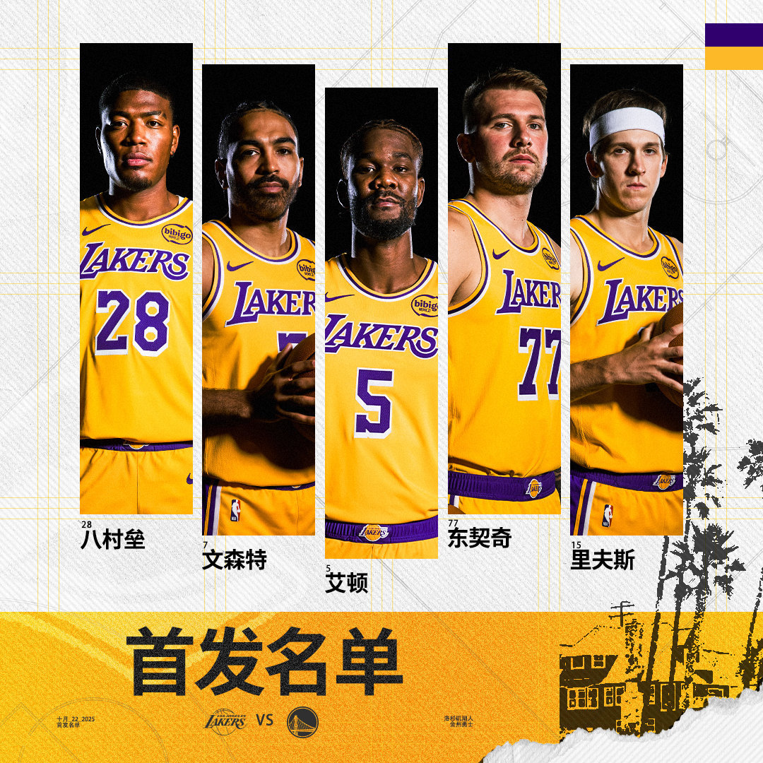 【#詹姆斯职业生涯首次缺席揭幕战#】今日NBA常规赛揭幕战,勇士将客场挑战湖人!湖人本场的首发阵容:东契奇+文森特+里夫斯+八村塁+艾顿。詹姆斯因右侧坐骨神经痛将至少休战3-4周,职业生涯23年来首次无缘揭幕战。