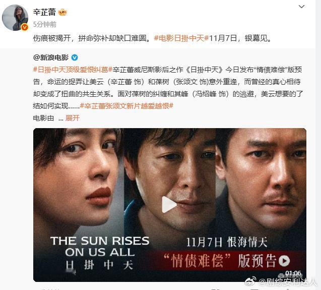 辛芷蕾说11月7日银幕见辛芷蕾说日掛中天11月7日银幕见 辛芷蕾喊 11.7 见!《日挂中天》里她演的美云,藏着七年未说的真相。