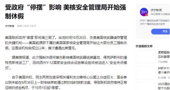 因发不出工资,美国核安全局近8成员工强制休假,核武器工厂被迫停工 美国政府停摆进入第20天,这场政治闹剧终于闹出了国际笑话。当地时间10月20日,美国参议院第11次表决拨款法案失败后,负责管理核武器的国家核安全局(NNSA)彻底撑不住了。 局长宣布近80%的雇员(约1400人)开始强制休无薪假,只剩400多人留守岗位。这意味着美国核武器工厂将被迫停工,核武库维护陷入半瘫痪状态。 这场危机的根源在于美国两党围绕医保补贴的扯皮,民主党要求延长《平价医疗法案》补贴,惠及2400万低收入人群;共和党则坚持削减福利开支。 双方在参议院反复拉锯,导致联邦政府从10月1日起停摆。原本以为只是普通的政治博弈,没想到最终把核安全局逼到了绝境。 而核安全局这次是真的“大出血”,根据通知,1400名员工中包括工程师、技术人员和管理人员,他们负责核武器的设计、维护和升级。仅剩的400人只能维持最基本的安保和应急响应,连日常巡检都难以保证。得克萨斯州的潘特克斯核武工厂、田纳西州的Y-12国家安全综合设施等关键场所,已经进入“安全关闭模式”,所有生产活动全部停滞。 更严重的是核安全局不仅管着自家员工,还监管着全国6万多名承包商雇员。这些承包商负责制造核材料、组装核弹头,是美国核武库的“生命线”。现在核安全局的监管团队休假了,承包商只能“自生自灭”。 消息人士透露,承包商们正在“勒紧裤腰带”维持最低限度工作,但资金最多撑到10月28日。一旦钱花完,整个核产业链将彻底停摆,连军方订单都无法交付。 除此之外核安全局的困境与白宫的“豪横”形成鲜明对比,就在核工厂停工当天,特朗普宣布启动白宫东翼改造工程,计划新建一座耗资2.5亿美元的豪华宴会厅。他声称资金来自私人捐款,还得意洋洋。然而媒体曝光的照片显示,东翼建筑已经被挖掘机拆得面目全非,而核安全局的员工却在为生计发愁。 这种“拆东墙补西墙”的操作引发众怒。民主党议员埃德·马基痛斥:“当核安全局员工被迫休假时,白宫却在大兴土木,这是对纳税人的背叛!”能源部长克里斯·赖特虽然坚称“核库存目前安全”,但他也承认,长期停摆将导致“可靠性下降”。核武器的维护和升级需要持续的专业投入,一旦中断,恢复起来可能需要数月甚至数年。 事实上,核安全局的困境只是美国政府停摆的冰山一角。过去20天里,75万联邦雇员被迫休假,机场安检排长队、国家公园关闭、经济数据延迟发布。特朗普非但没有积极解决问题,反而威胁要利用停摆“精简政府”,甚至暗示可能裁员。这种“破罐子破摔”的态度,让国际社会对美国的治理能力产生质疑。 最讽刺的是核安全局的危机本可以避免。早在10月3日,能源部长就警告说,核安全局的资金只能支撑8天。但两党依然沉迷于政治博弈,错过了最后的补救机会。现在,当核工厂停工、承包商告急时,他们才开始互相甩锅。共和党指责民主党“阻挠拨款”,民主党则批评共和党“拿核安全当筹码”。但无论怎么辩解,受损的都是美国的国家安全和国际形象。 这场危机也暴露了美国政治体制的深层弊端。两党为了短期利益,不惜牺牲国家核心职能。核安全局的员工用脚投票——许多人开始寻找新工作,技术人才流失的风险正在加剧。如果停摆持续下去,美国可能面临“核人才断层”的长期后果,这对其全球战略地位将是致命打击。 目前,美国政府停摆仍在持续,核安全局的命运悬而未决。国际社会正密切关注,这个自诩为“全球领导者”的国家,如何在政治闹剧和国家安全之间找到平衡。而对于普通美国人来说,他们可能从未想到,一场关于医保补贴的争吵,最终会让核武器工厂停工,让国家陷入如此荒唐的境地。 来源:济宁新闻 【受政府“停摆”影响 美核安全管理局开始强制休假】