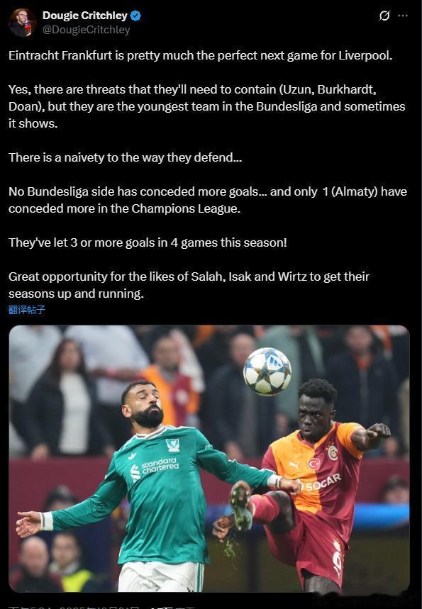 天空体育记者评论,对利物浦来说,接下来对阵法兰克福的比赛堪称翻盘契机。