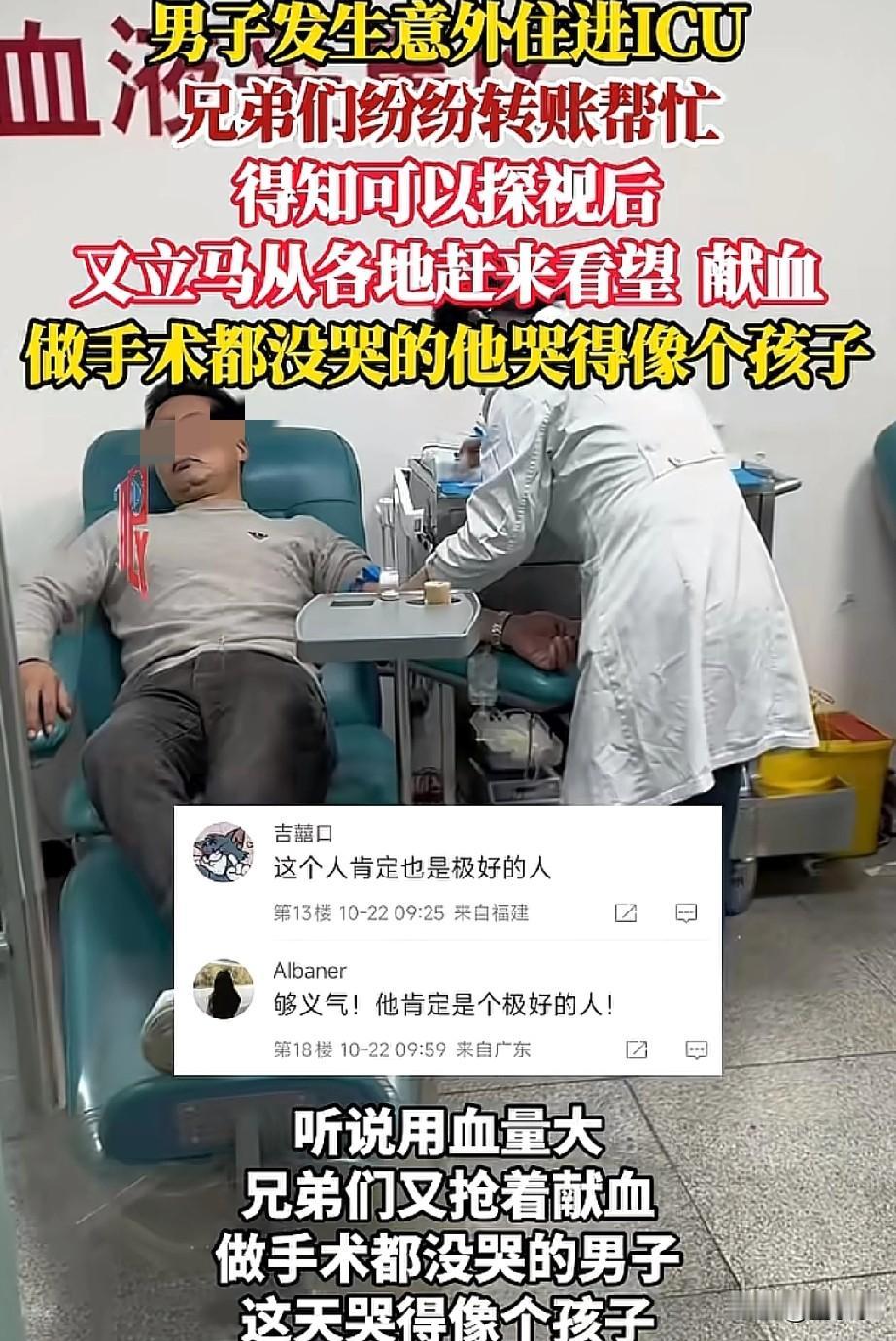 这才是兄弟!河南郑州一男子发生意外后住进了ICU,兄弟们得知后纷纷都转账帮忙,抢着献血,网友:这才是真兄弟! 李先生突发意外住进了ICU接受治疗,兄弟们得知后个个都转账支援,还不停的打听情况,但是由于重监病房无法探视,兄弟们只能隔着屏幕来问候。 这不一听转到普通病房内可以探视了,兄弟们纷纷赶回来探视,还带了很多的礼品,因为病房内没有凳子坐,大家就蹲在墙角。 尤其,是在听说治疗的过程中需要大量的血液,兄弟们没有片刻的迟疑,争先恐后的去献血。 李先生在做手术的时候没有哭,却看到了兄弟们后可是哭的泣不成声,这份兄弟情他们用实际行动来表达。 所以,人只有生病或落难,才知道身边有多少真朋友真兄弟,不过前提是你自己的人品要好才行。