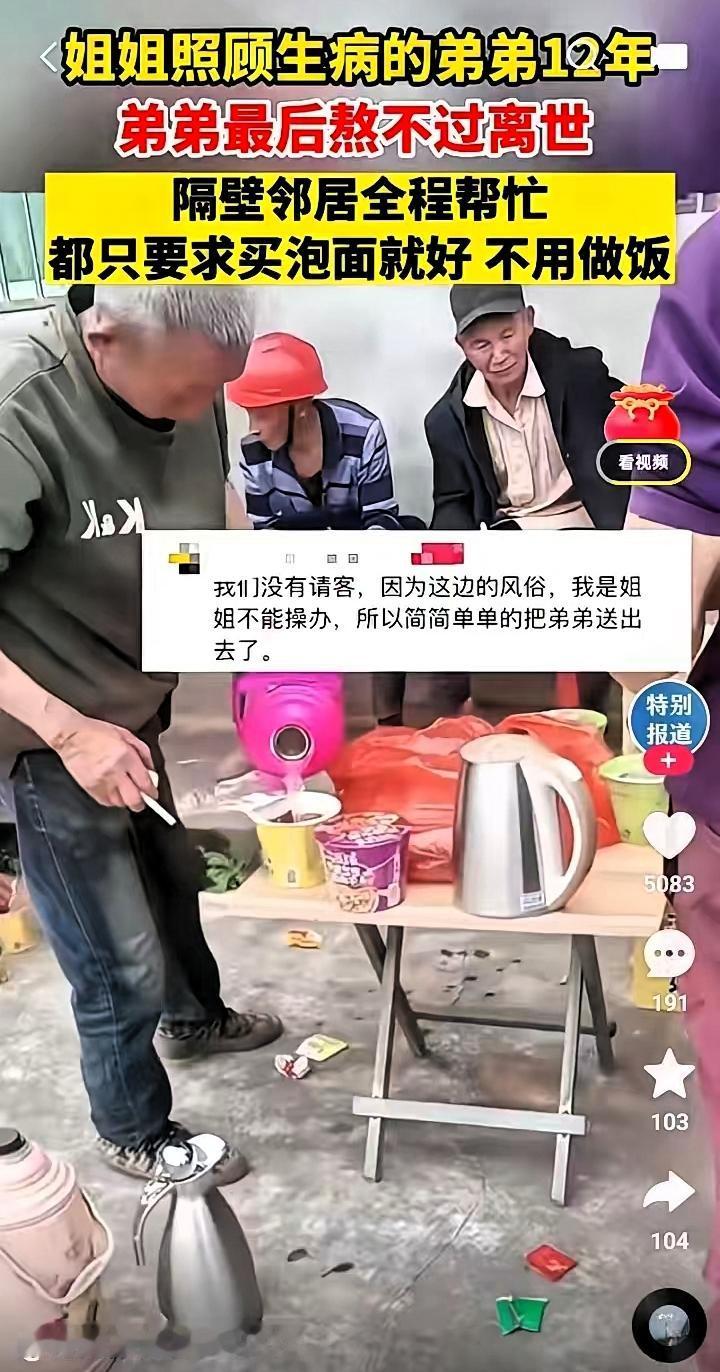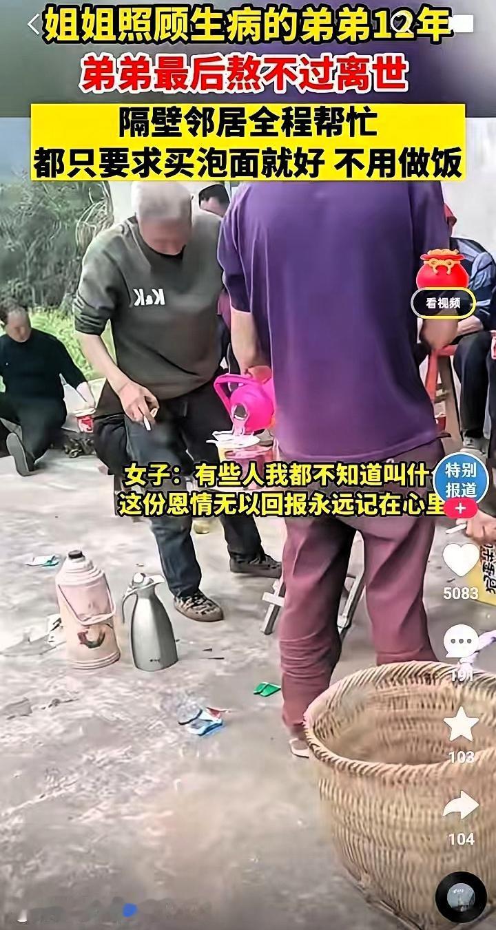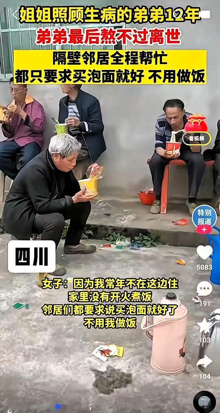催人泪下的一幕!四川的一个年轻女孩照顾生病的弟弟12年,当弟弟最后被病魔夺走生命的时候,全村人上门帮忙料理后事 小丽(化名)从小没了爹妈,跟弟弟相依为命长大。后来她结了婚,本以为日子能安稳点,可婚后第二年,弟弟查出癌症,一下就卧床不起了。 她没半点犹豫,直接搬回娘家照顾弟弟,这一守就是12年。自己的嫁妆、家里的积蓄,全都拿来给弟弟治病,可最后,弟弟还是没能留住。 弟弟走后,小丽一个人撑着办后事,眼睛肿得通红,人也没什么精神。第二天一早,村里的街坊邻居都主动过来帮忙了。有人帮着搭灵棚,有人帮着收拾屋子,还有人默默去镇上买了纸钱香烛,不用招呼,各自找活干。 大家看她红着眼圈要往厨房走,想烧水做饭招待大家,都赶紧上前拦住。有人说:“别折腾了,饭不用做,我们都带了泡面,开水泡一下就好,不麻烦。”还有人说:“你这12年已经够累了,现在啥也别管,坐着歇会儿,后事有我们呢。” 乡亲们哪是吃不起一顿饭,是都看在眼里,知道她这些年为了弟弟,操碎了心、熬尽了力。现在弟弟走了,她已经够难了,没人想再让她为了招待大家,多操一份心、多累一分力。 小丽对弟弟12年不离不弃,是姐弟间的情分;乡亲们劝她吃泡面,是邻里间最实在的体谅。这不是什么轰轰烈烈的大事,可就是这份不添麻烦的关心,让人心里暖烘烘的。 都说现在人情淡了,可在村里,这种朴素的善良一直都在。难的时候,有人愿意搭把手,还想着不给你添负担,就是最难得的帮助。你们身边,是不是也有这样互相体谅的街坊邻居?