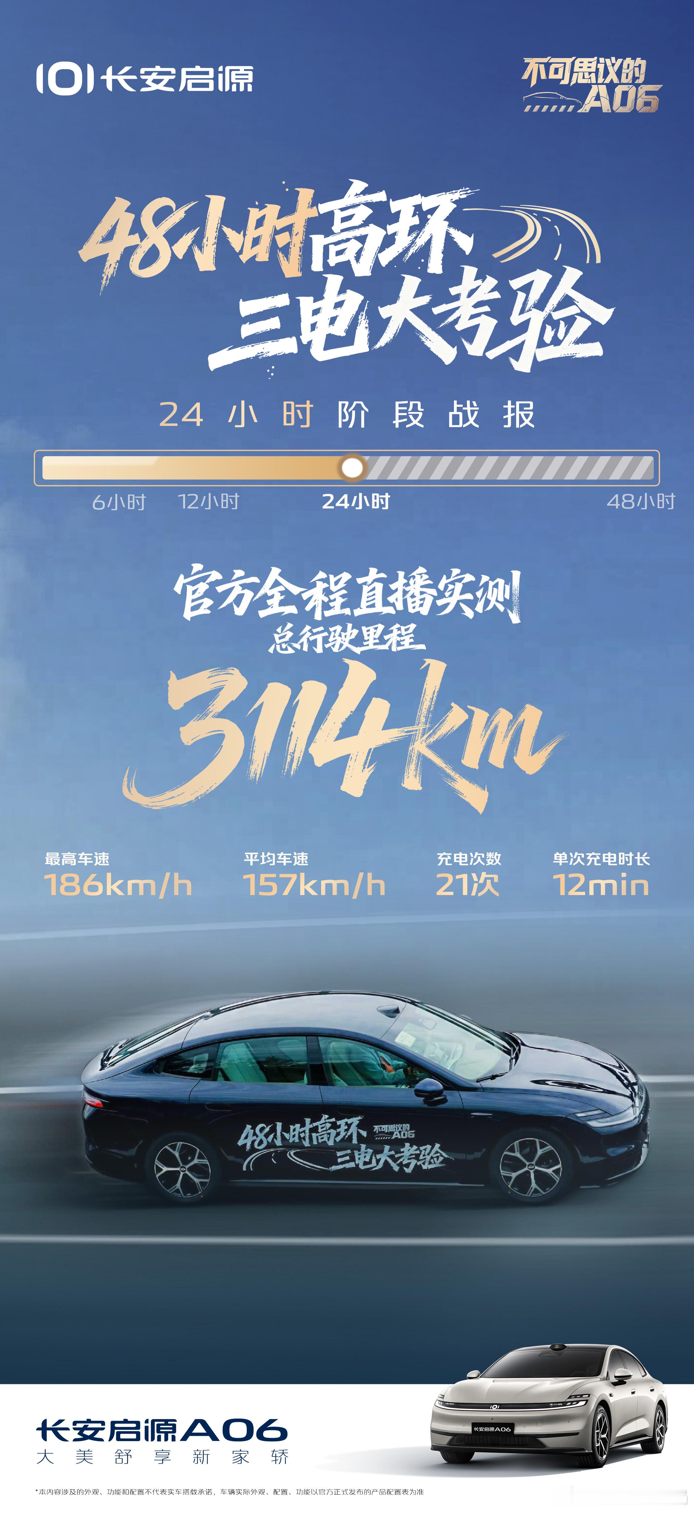 启源A06高环24小时累计行驶3114km新车情报局近日,发起启源A0648小时高环三电大考验 挑战,最新成绩战报来了, 长安启源A06车型24小时累计行驶 3114km,最高车速达到186km/h,平均车速157km/h,充电次数21次,单次充电时长12min,平均充电行驶里程260km。大家觉得这个成绩如何? ​​​