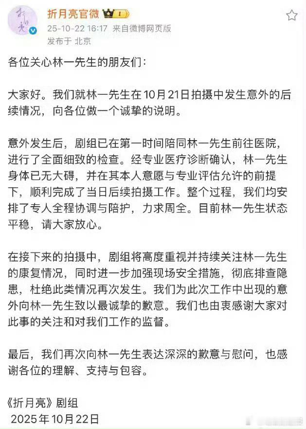 折月亮发布长文回应林一受伤,在道歉信中详述陪护安排,说明专人全程跟进,保障林一的就医与拍摄衔接。信中致歉并表示会强化安全管理。这种安排展现了处理的周全性。折月亮发长文回应林一受伤折月亮道歉信