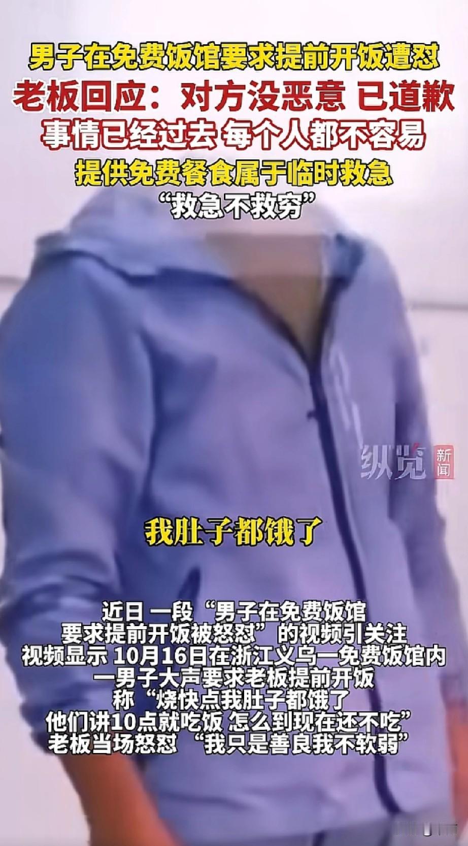 浙江义乌“我们在义乌的家”免费饭馆,每天给环卫工人、困难人群供餐。 一名男子进店大声催开饭,说“烧快点,肚子饿了,不是说10点吃吗”。老板直接回应:“我只是善良,不软弱!别发号施令,等不了就走,你不是大爷,我不是店小二”。 事后老板说,男子是来要垃圾袋捡瓶子的,不是找茬,可能听人说10点开饭才急了,后来也道歉了还来吃过。 网友都挺支持老板。善良是自愿帮忙,不是必须迁就的义务。受助者得懂尊重,不能把别人的好心当理所当然。 公益本是传递温暖的事,得施助者有底线、受助者有分寸,这份善意才能长久传下去。