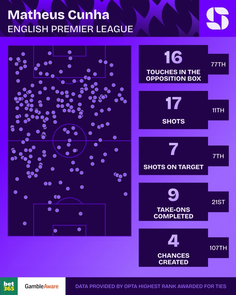 库尼亚本赛季再次成为联赛中射门次数最多的球员之一,平均每90分钟射门3.46次,这可能会对曼联的进攻产生连锁反应。